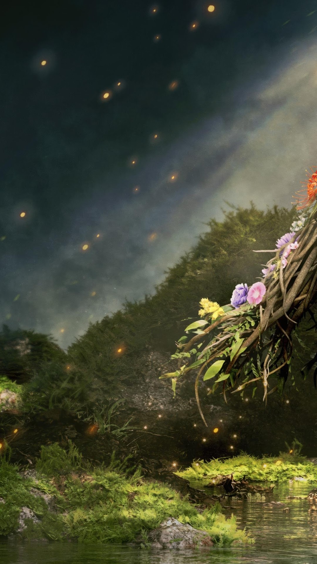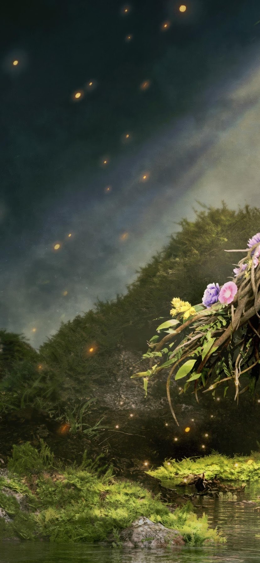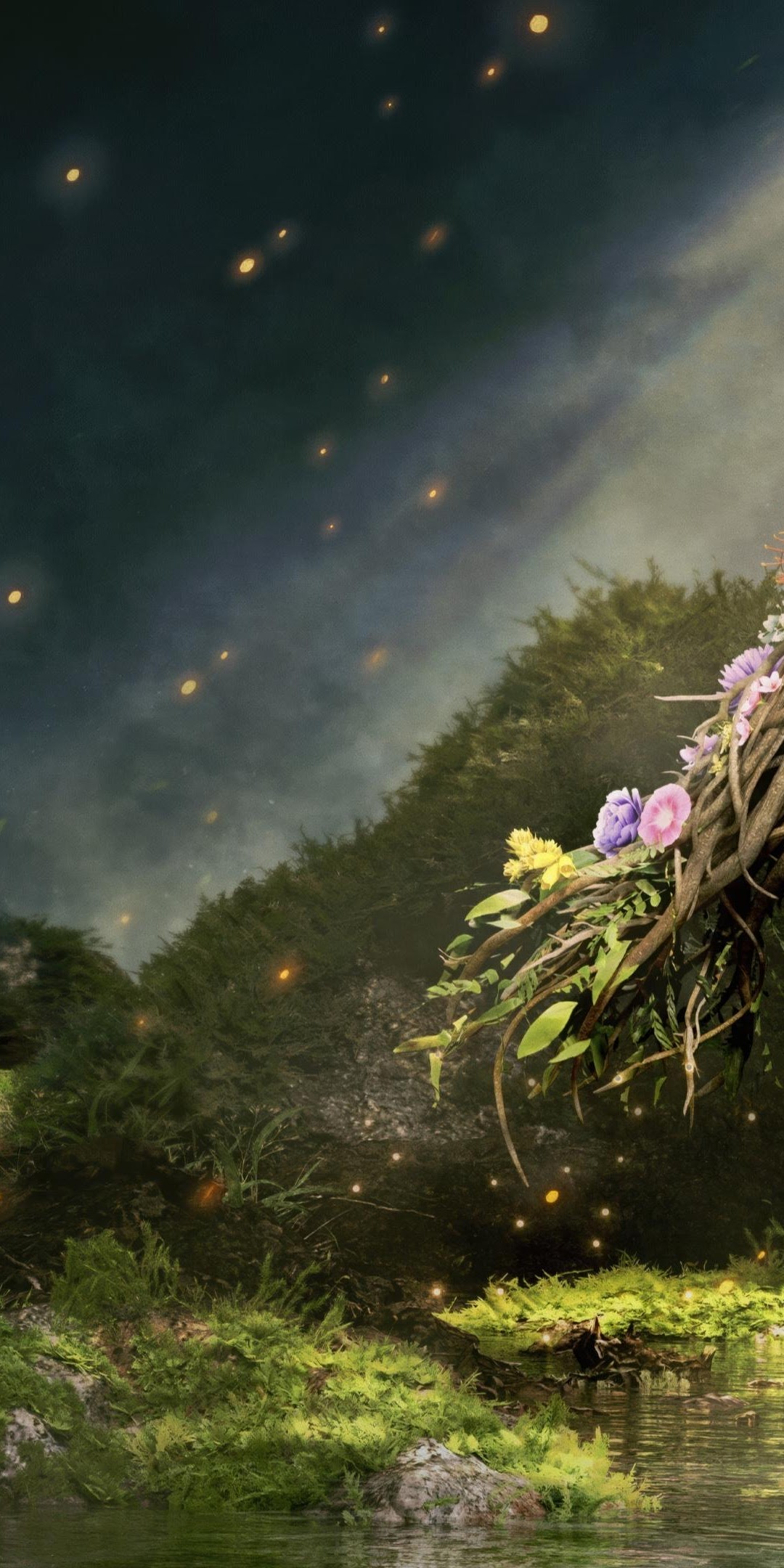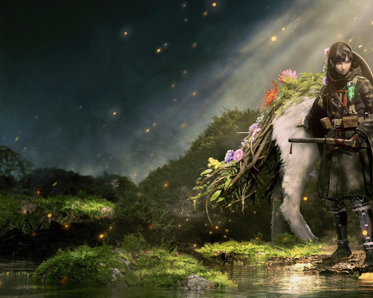 A dark warrior girl stands next to a large, floral-decorated white wolf in a misty, enchanted forest scene.