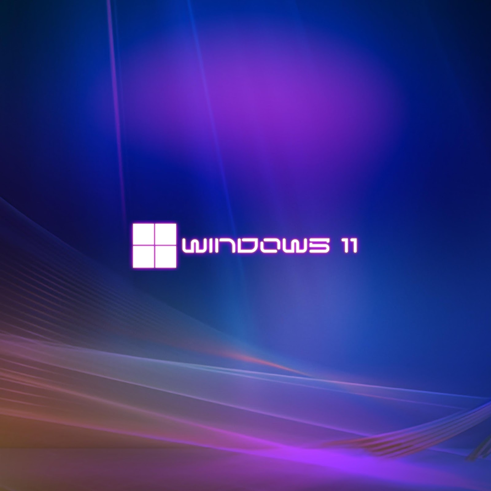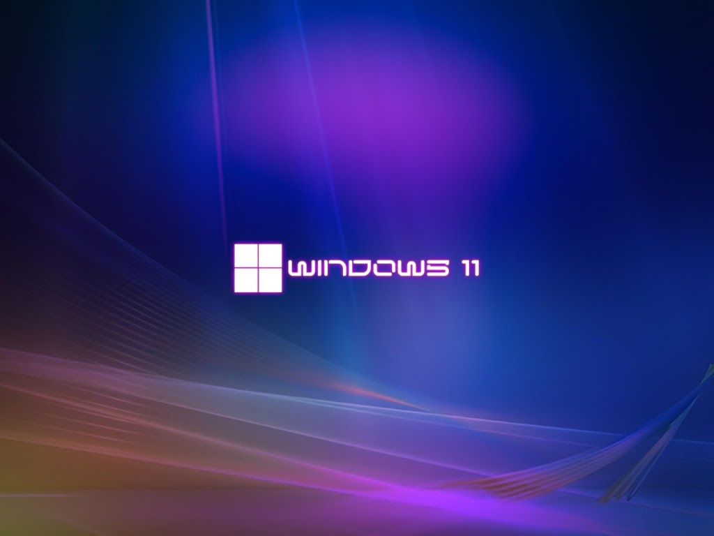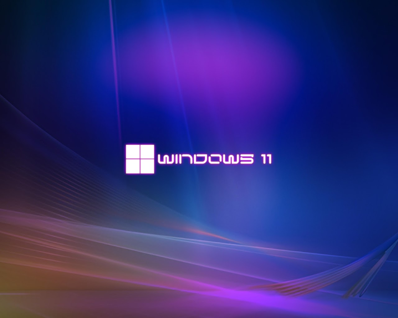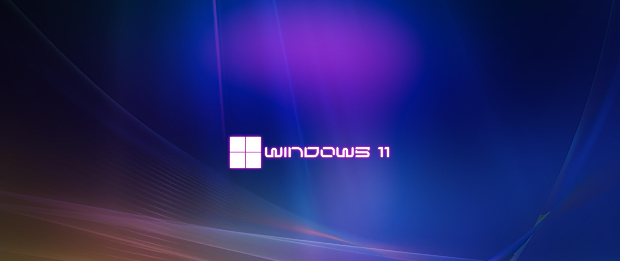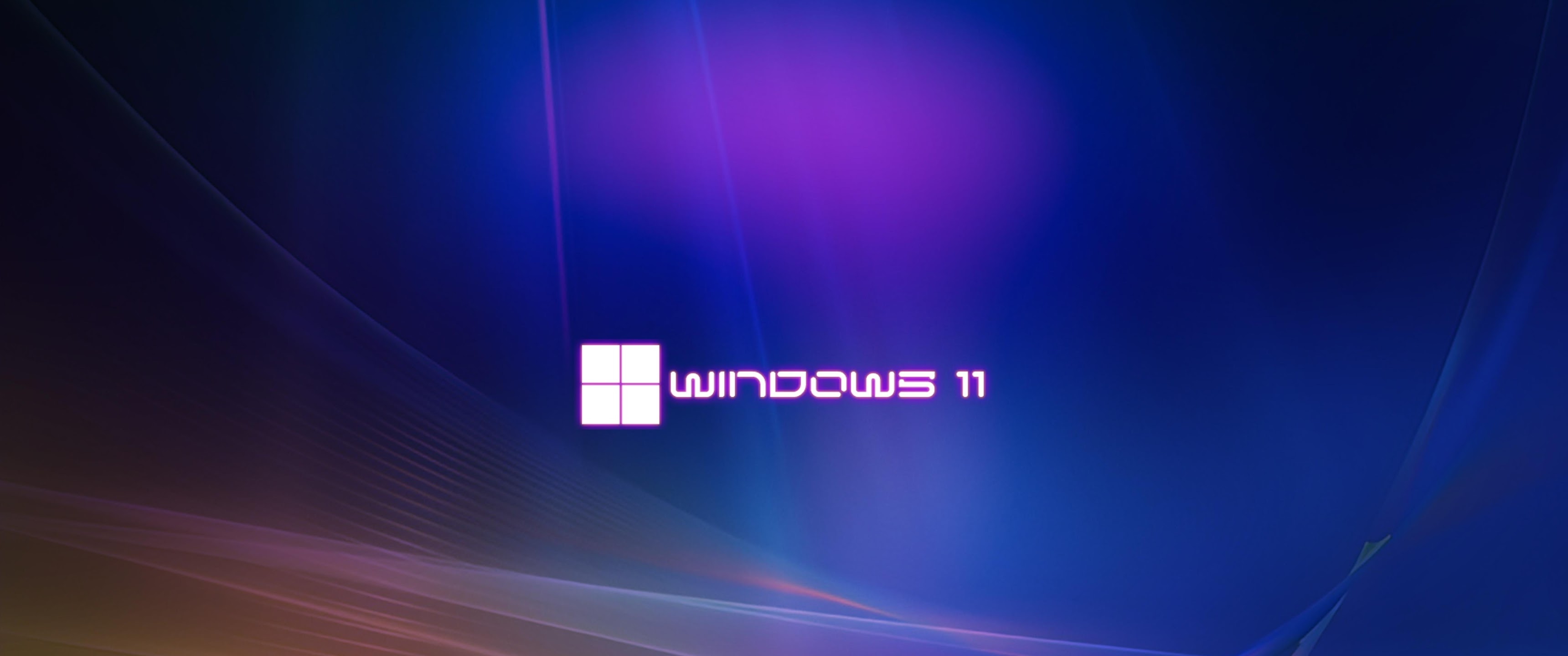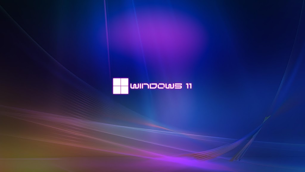 The Windows 11 logo sits in the center of a deep blue background with flowing purple neon light streaks and abstract waves.