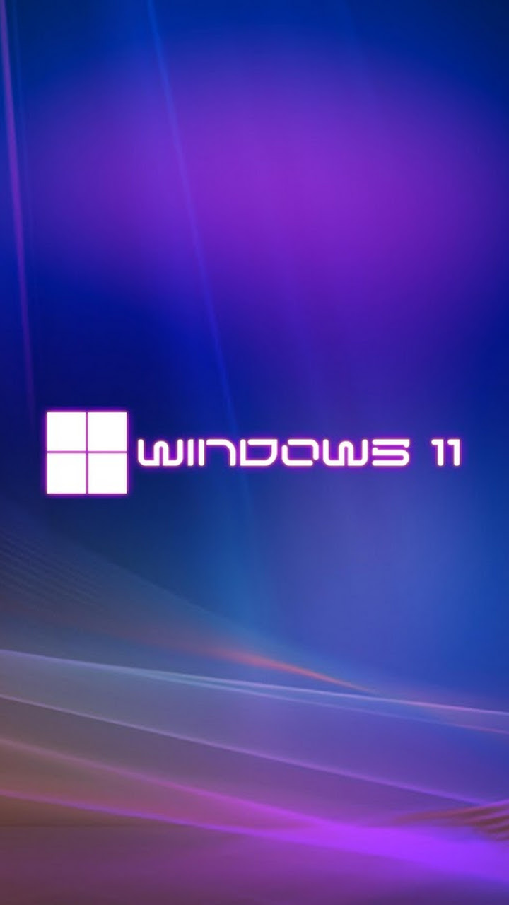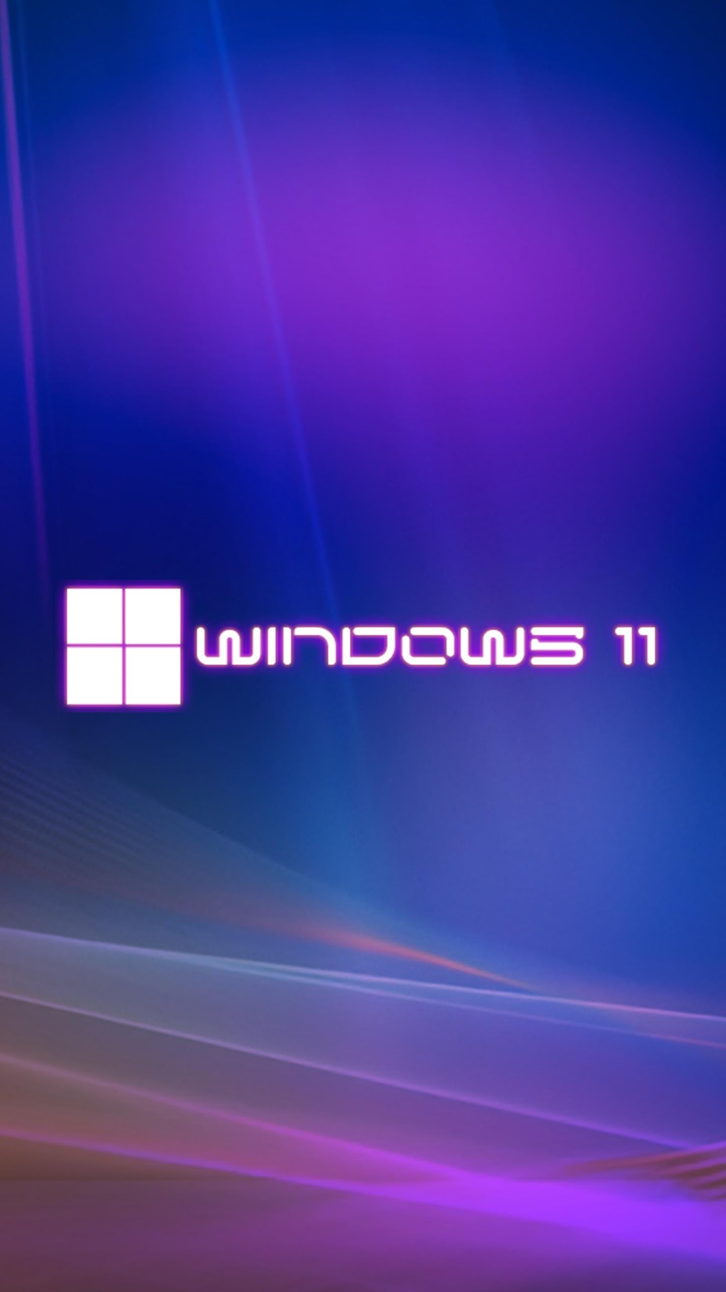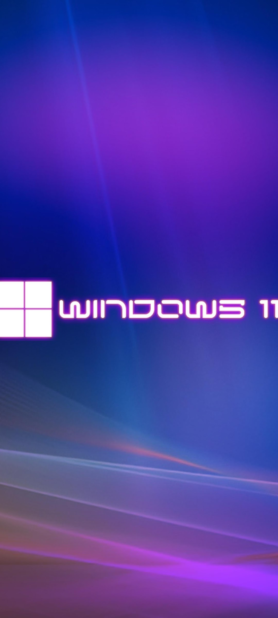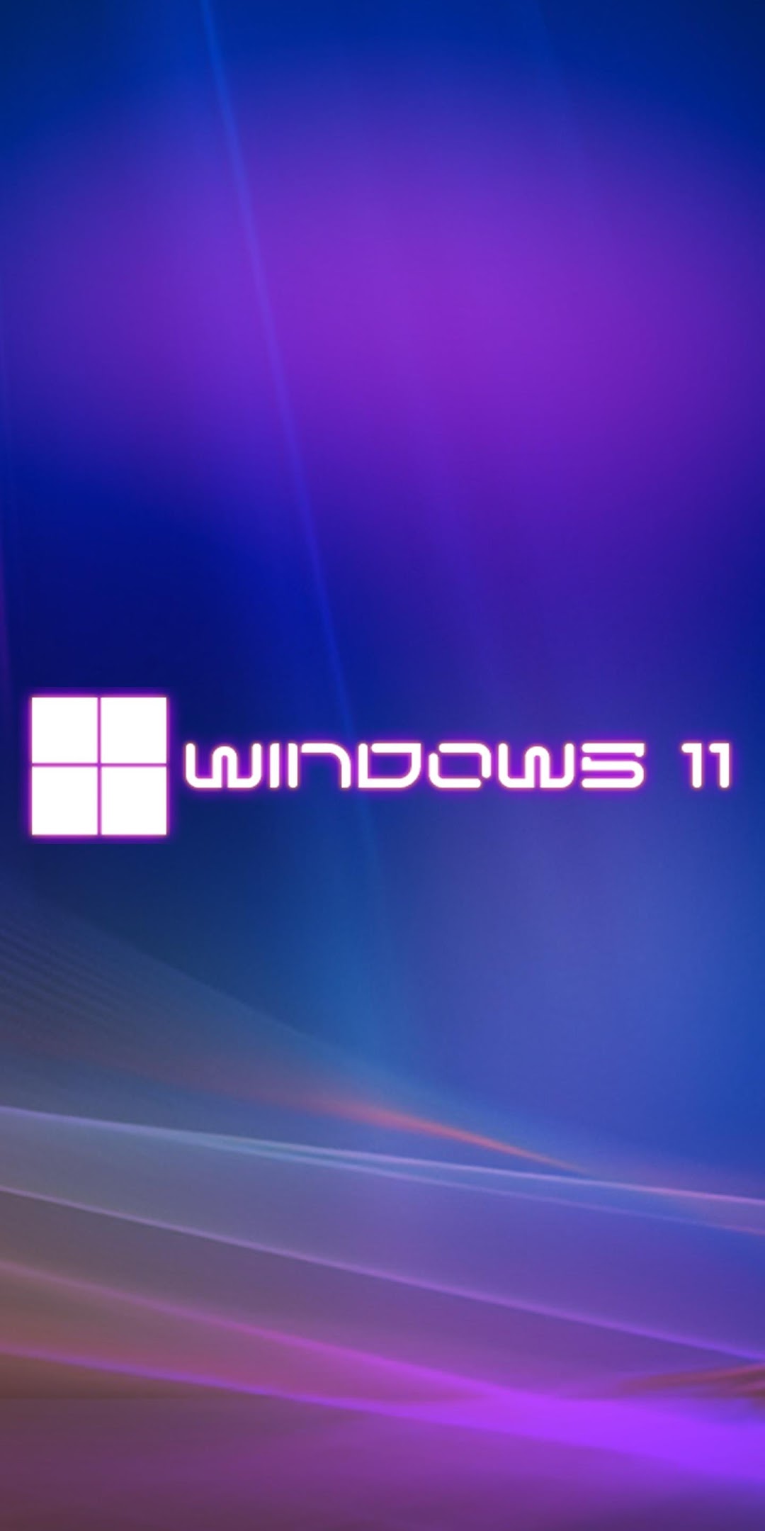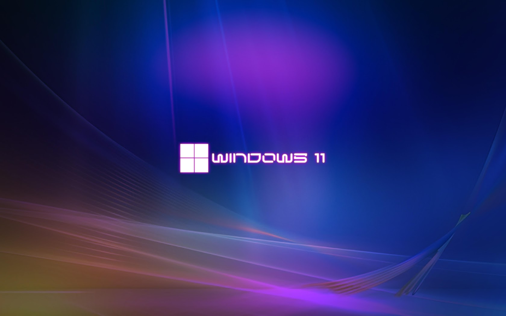 The Windows 11 logo sits in the center of a deep blue background with flowing purple neon light streaks and abstract waves.