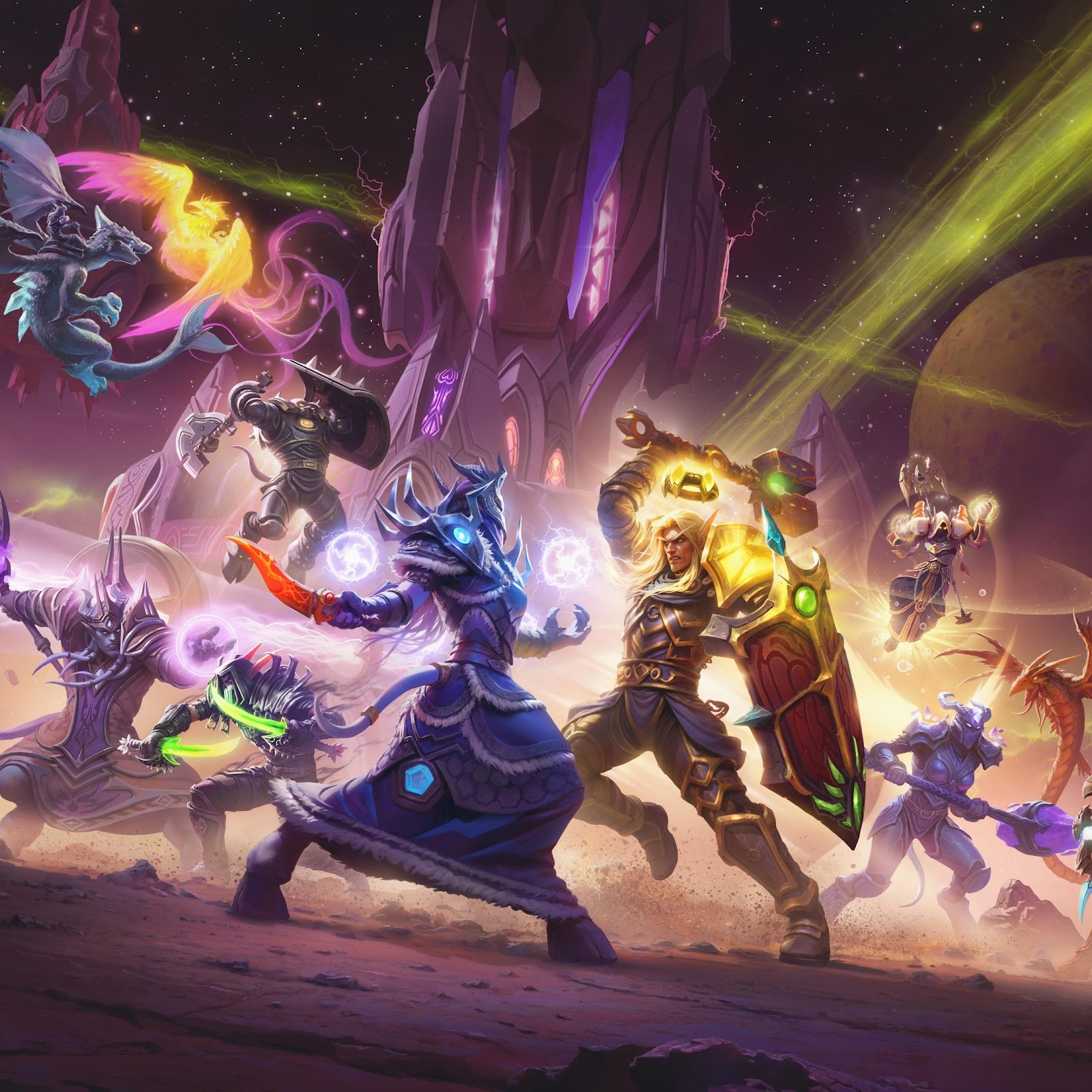 Iconic heroes from World of Warcraft engage in an epic battle on a purple alien planet with dragons flying above a glowing magical tower.