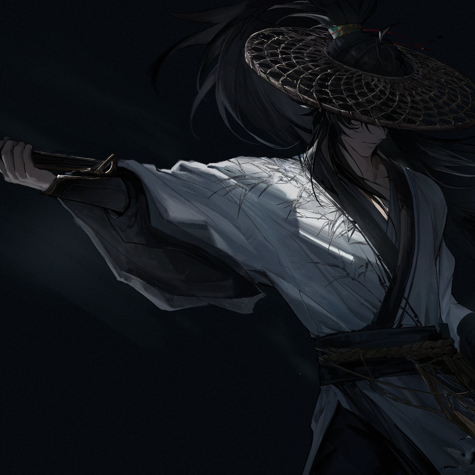 A mysterious figure wearing a straw hat and white robes stands dramatically in dark shadow, holding a thin sword with an intense vibe.