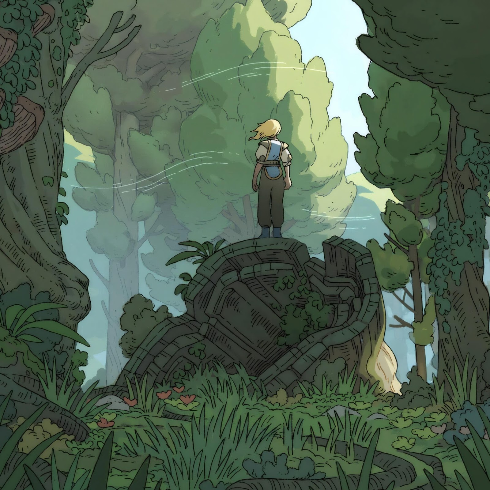 A young traveler stands on ancient ruins looking out into the misty, overgrown forest with a fantasy illustration style.