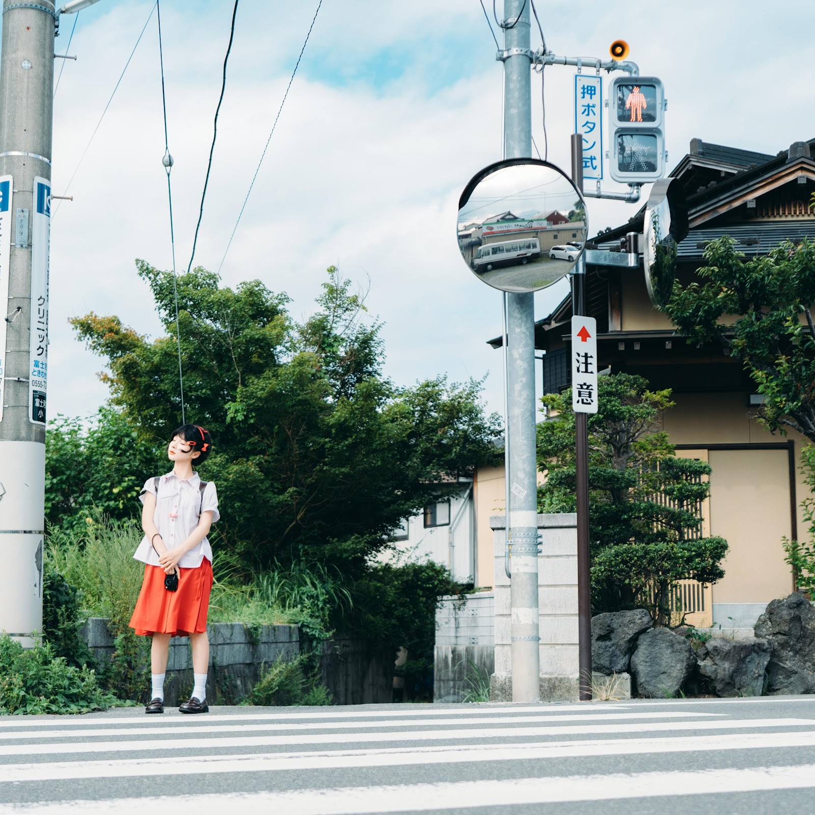A young woman in a white shirt and bright red skirt stands on a crosswalk in a quiet Japanese residential area on a sunny day.