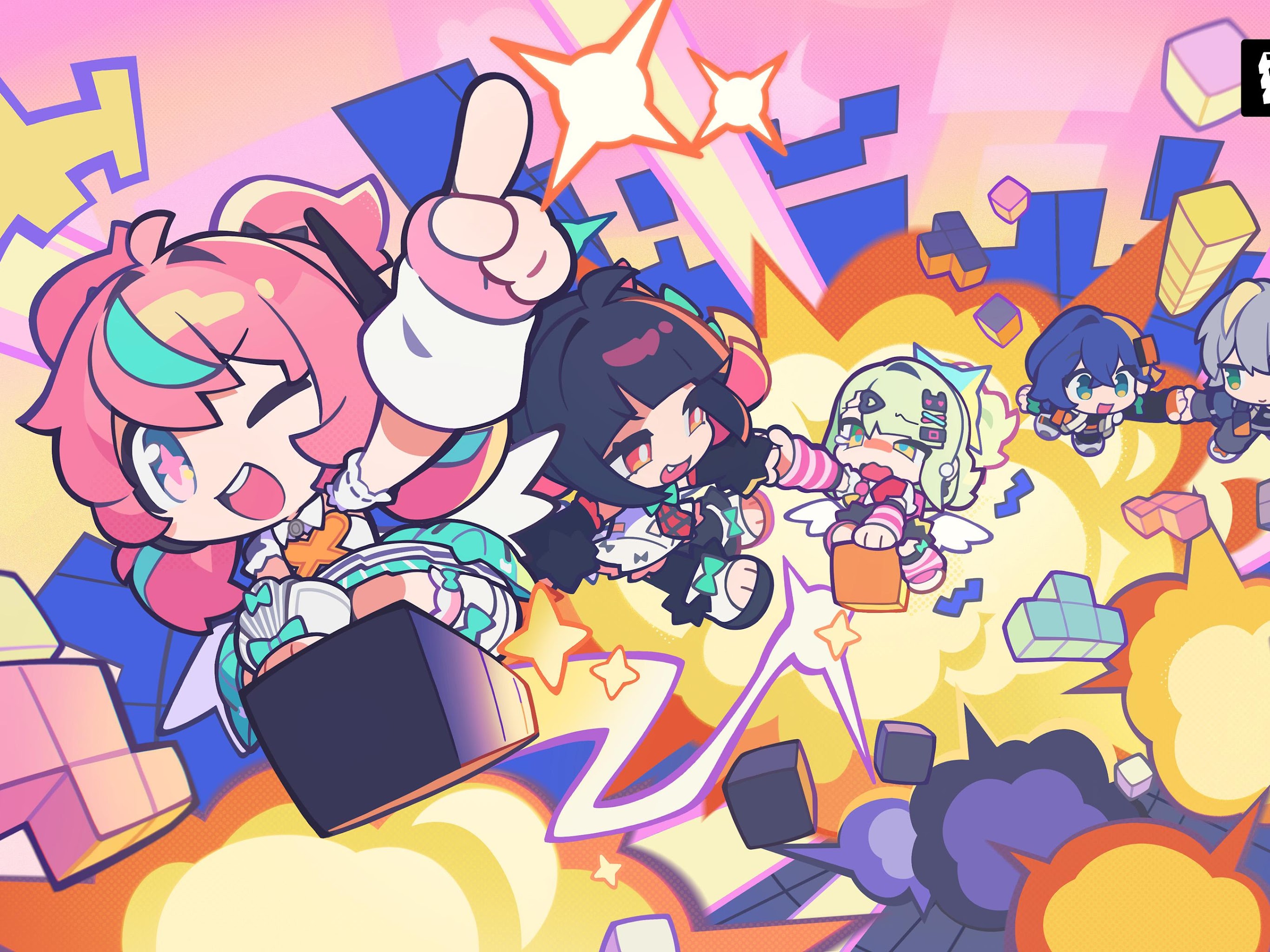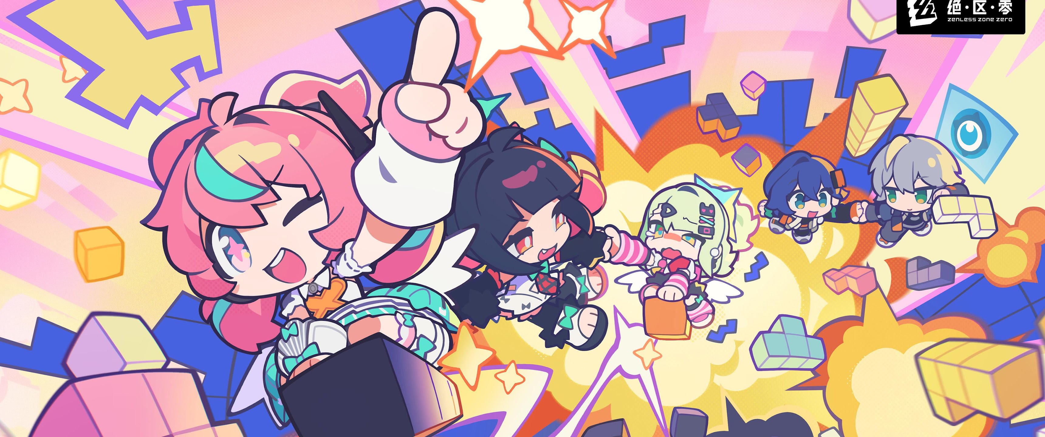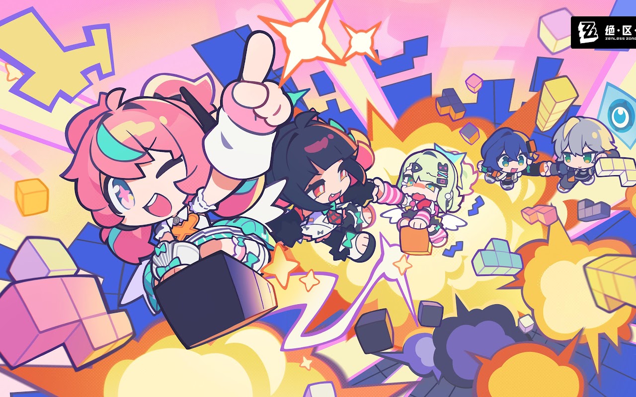Chibi characters from Zenless Zone Zero jump through a vibrant explosion filled with colorful geometric blocks and bright stars in this energetic digital illustration.