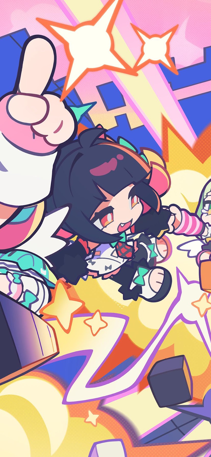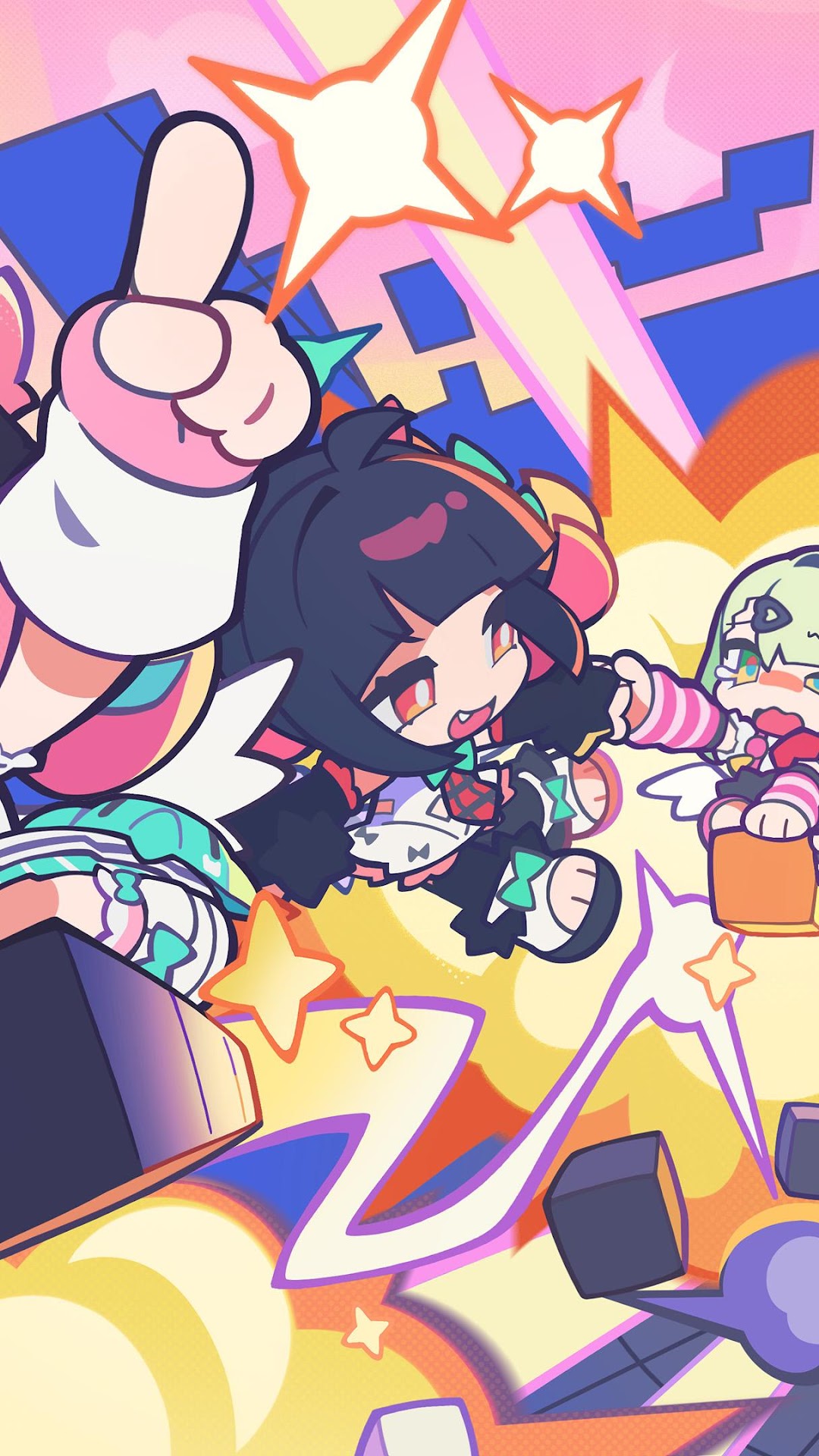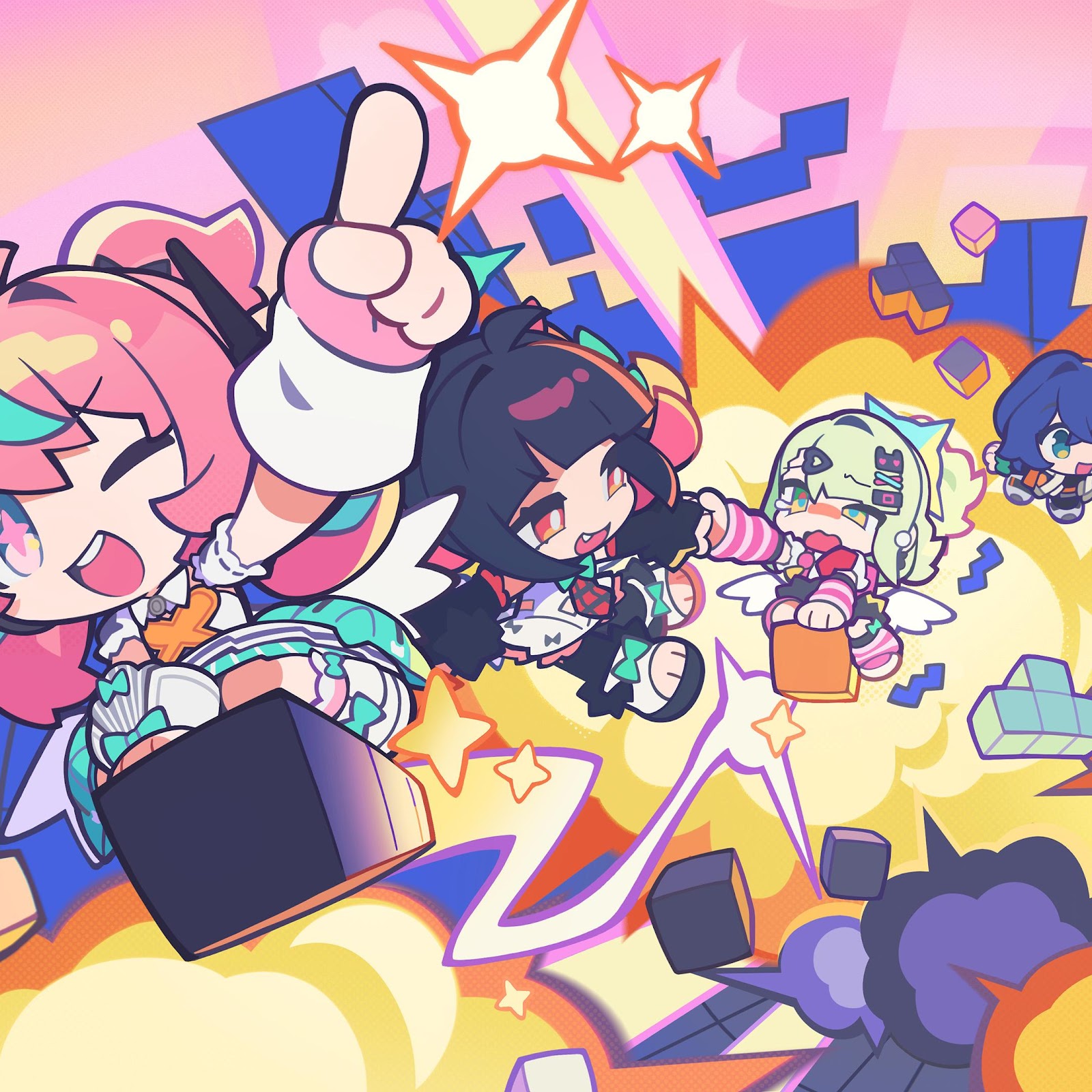 Chibi characters from Zenless Zone Zero jump through a vibrant explosion filled with colorful geometric blocks and bright stars in this energetic digital illustration.