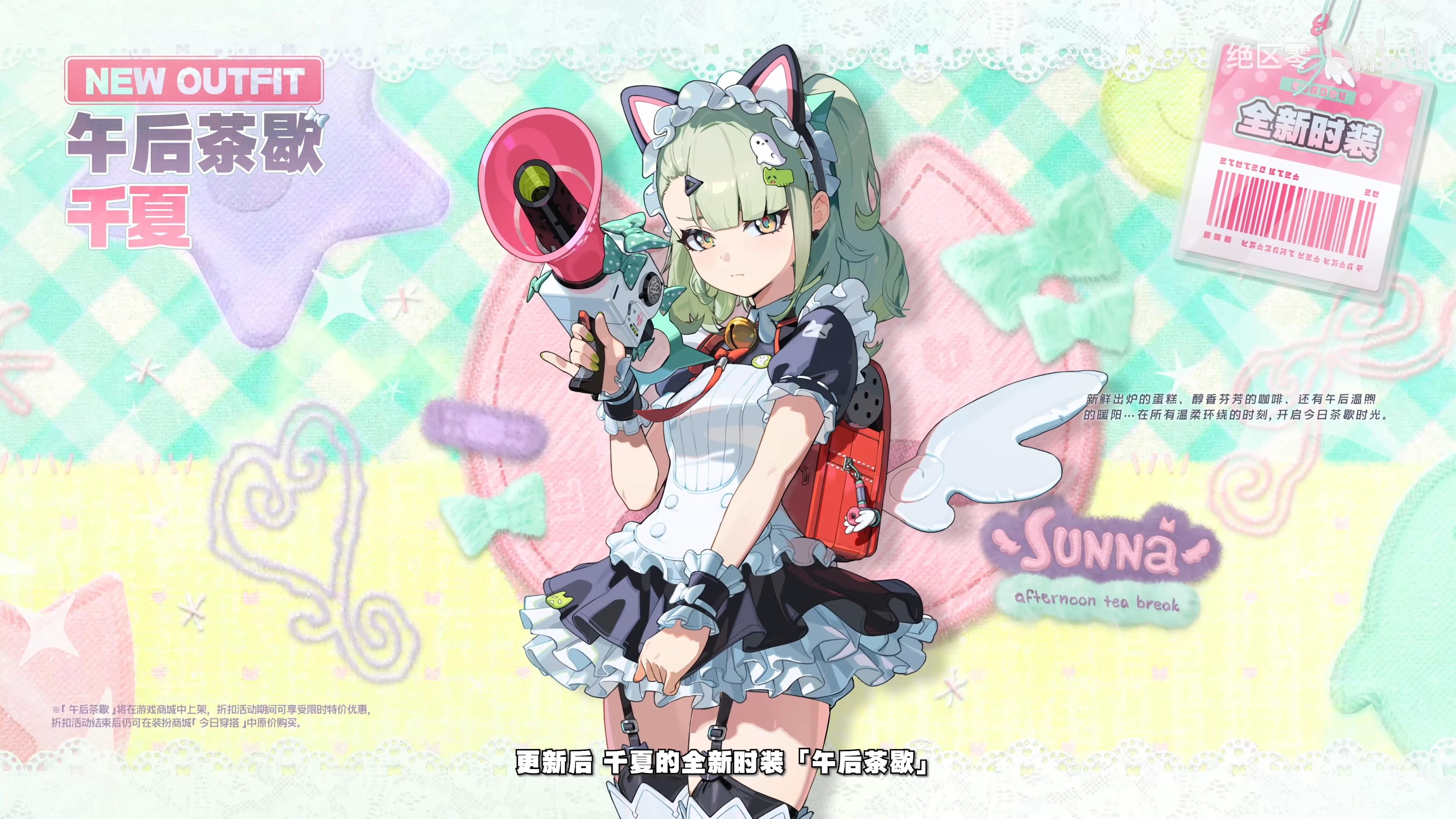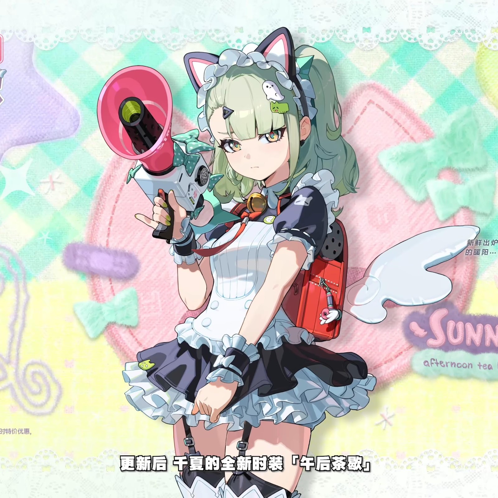 Soukaku from Zenless Zone Zero wears a cute maid outfit with cat ears while holding a pink megaphone in front of a pastel patterned background.