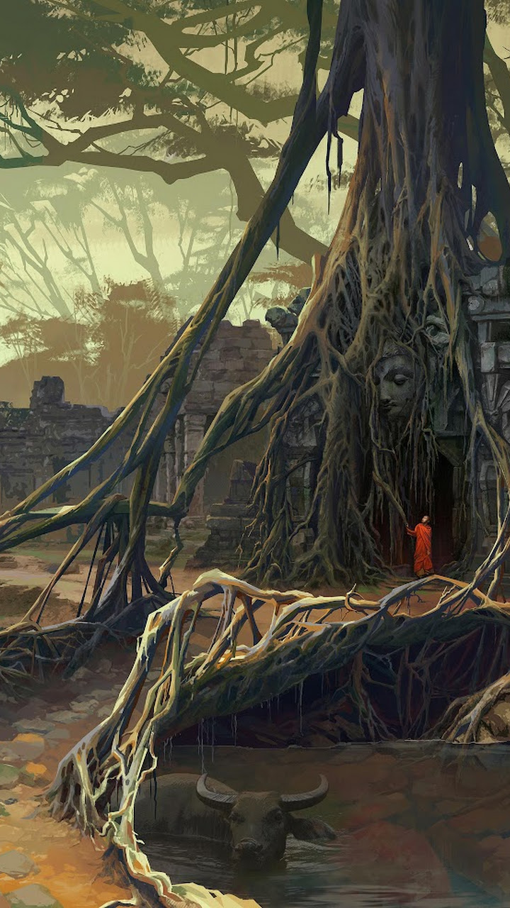 A Buddhist monk stands before an ancient stone temple overgrown with massive tree roots in a lush jungle setting with a water buffalo nearby.