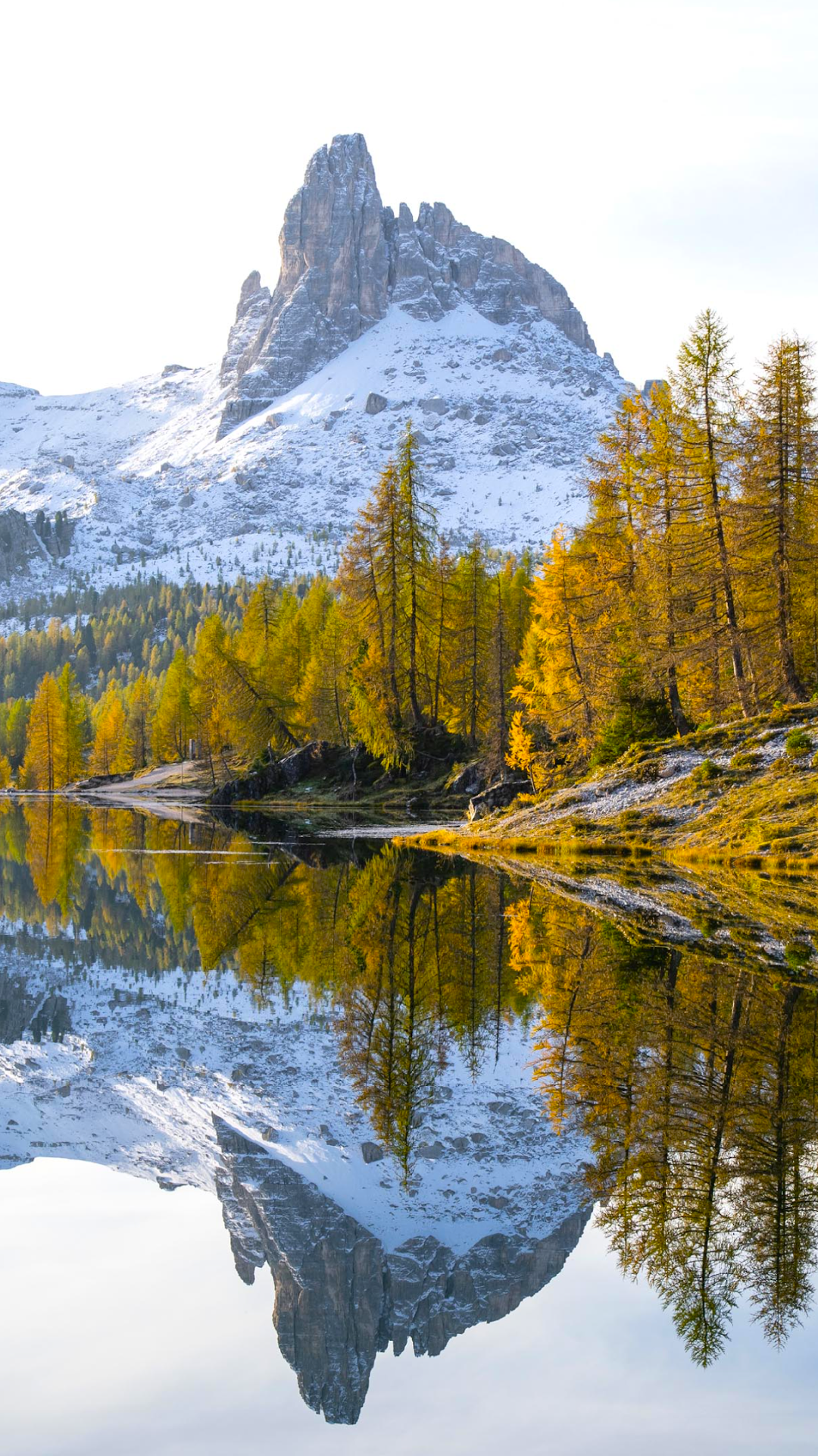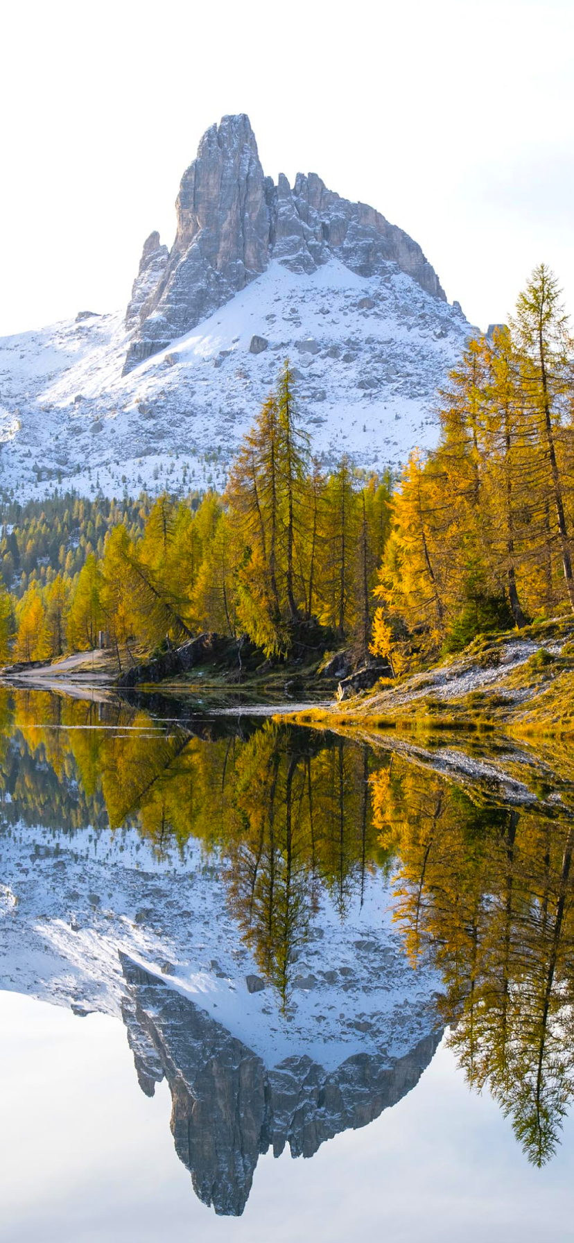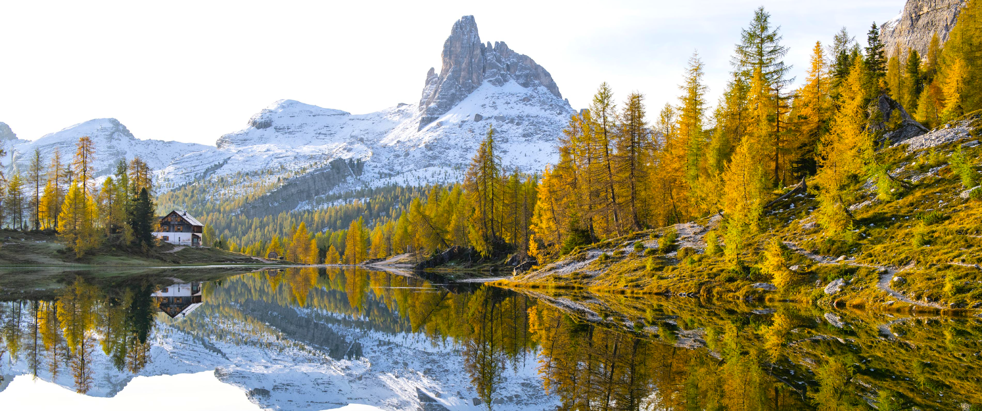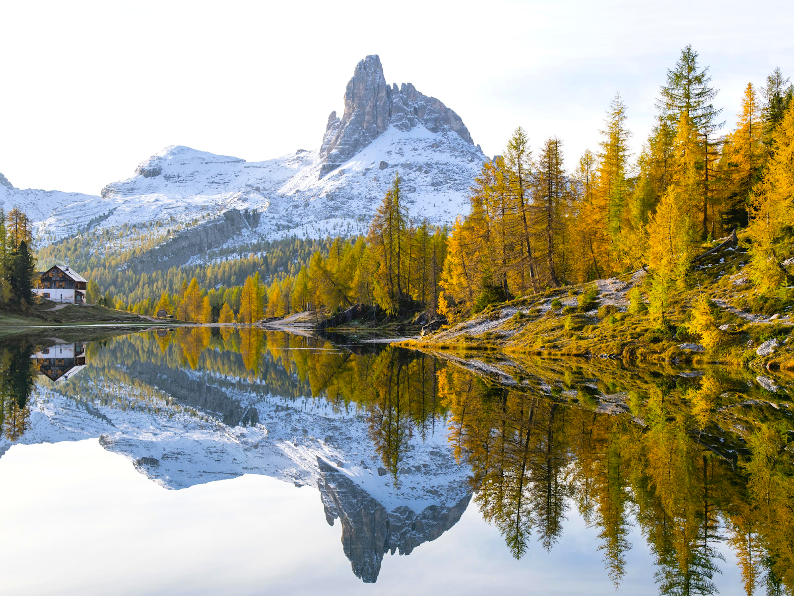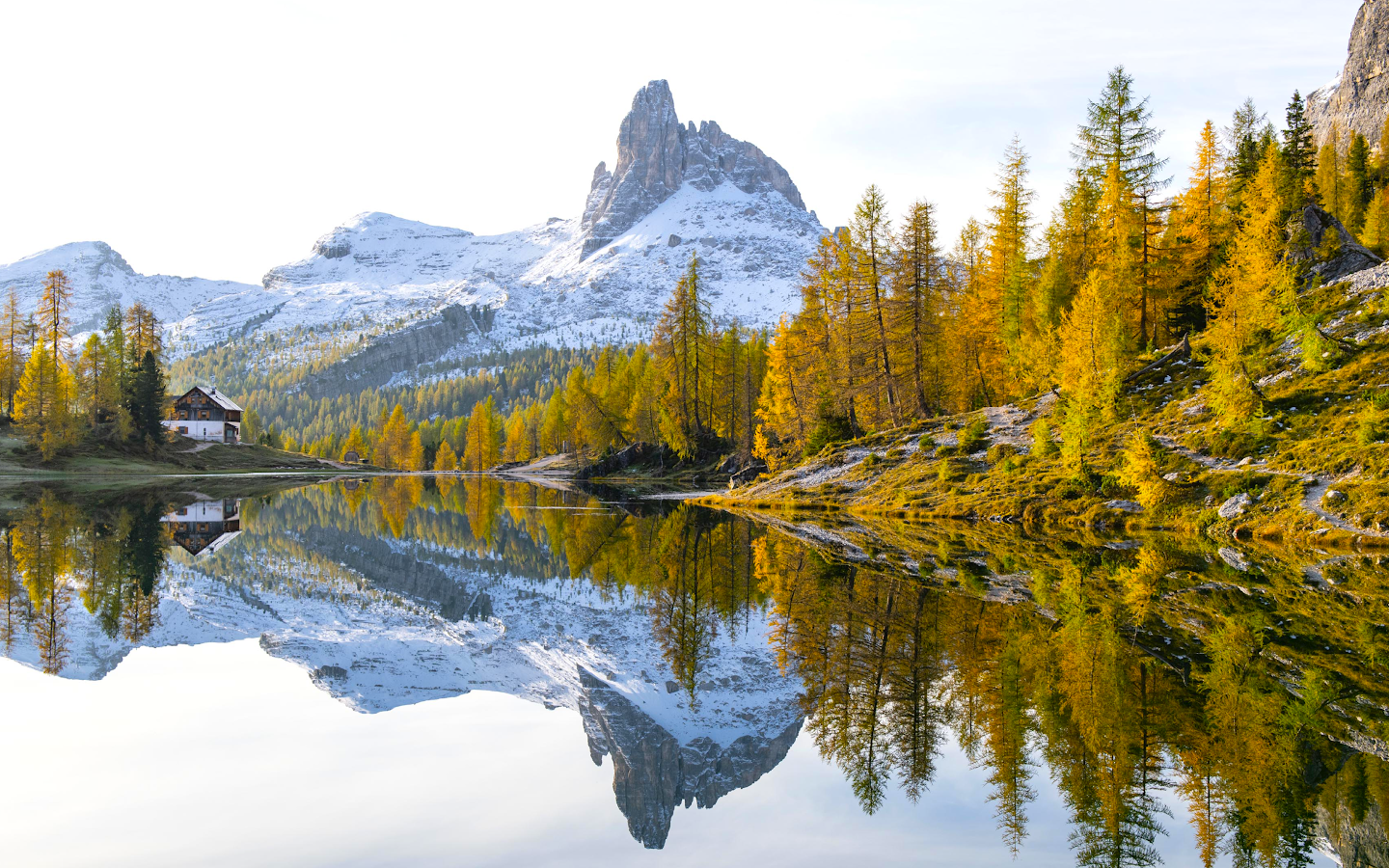 The peak of Becco di Mezzodì stands over Federa Lake with golden larch trees and a small cabin reflected in the calm water showing a peaceful autumn morning.