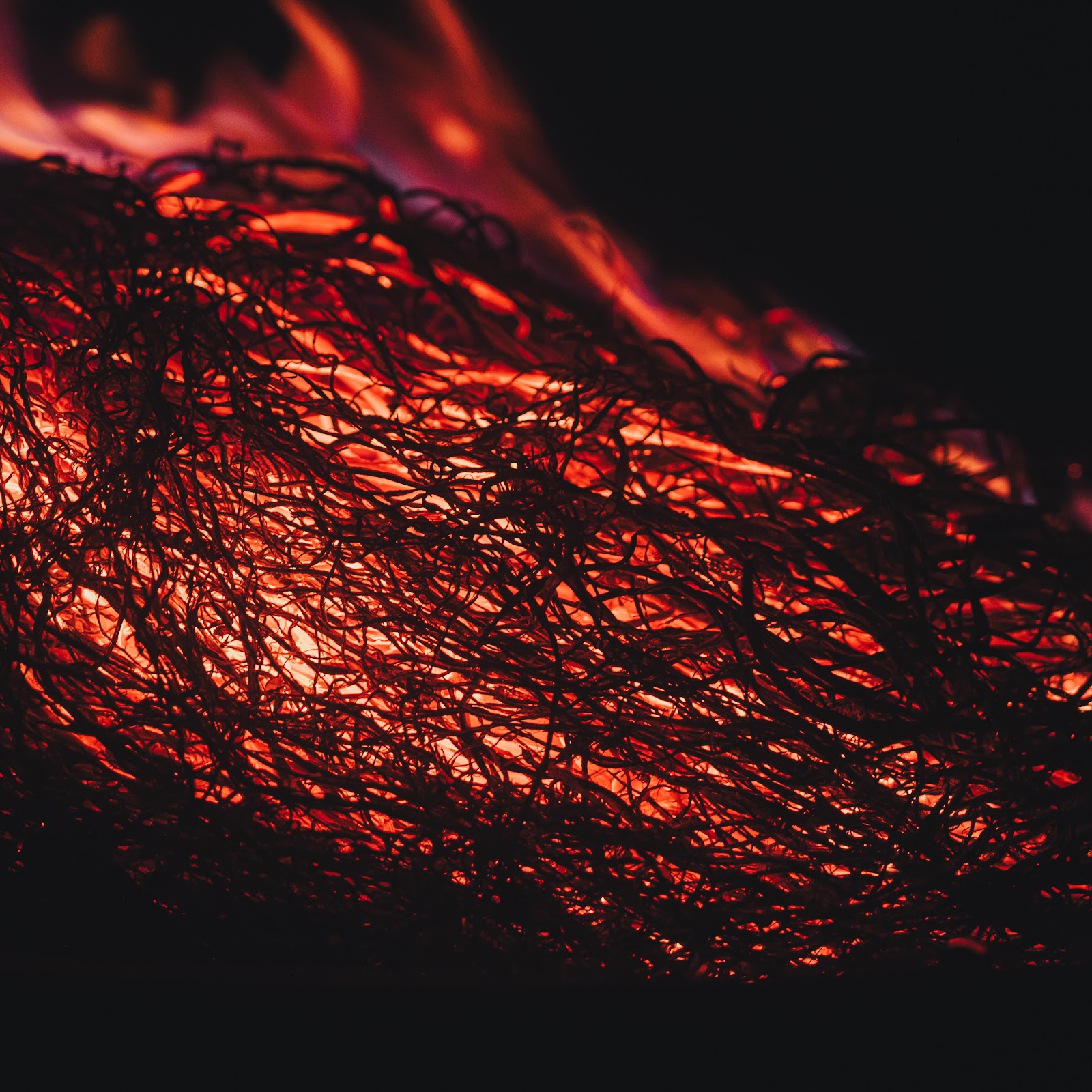 Glowing steel wool burns intensely in the dark with bright orange light and small flames showing a beautiful abstract pattern.