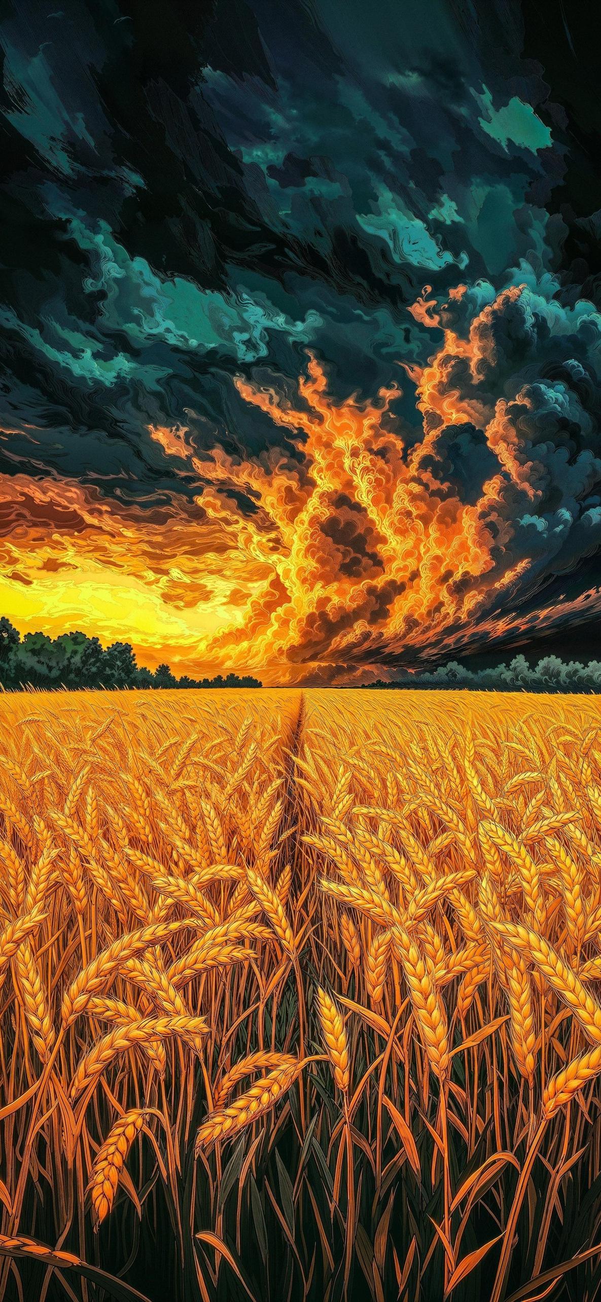 Golden Wheat Field At Sunset Full HD iPhone Wallpaper A vast golden wheat field grows under a dramatic sunset with fiery orange clouds and dark stormy swirls showing a vibrant digital art style. ix965 741.47 KB 1185x2567 Download original File Size: Dimensions: Resolution: Full HD Format: Mobile ID: Digital Art Landscape Nature Orange Stormy Clouds Sunset Wheat Field
