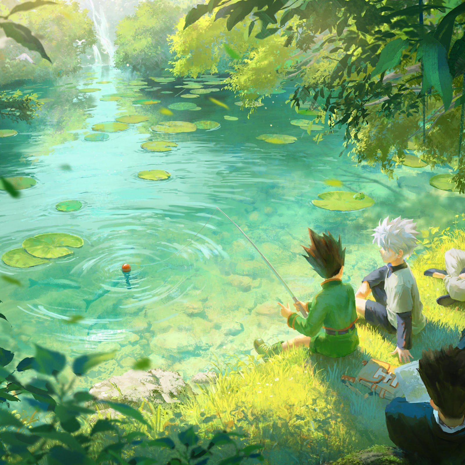 Gon and his friends from Hunter x Hunter sit by a peaceful green riverbank while fishing under the bright summer sun in a lush forest.