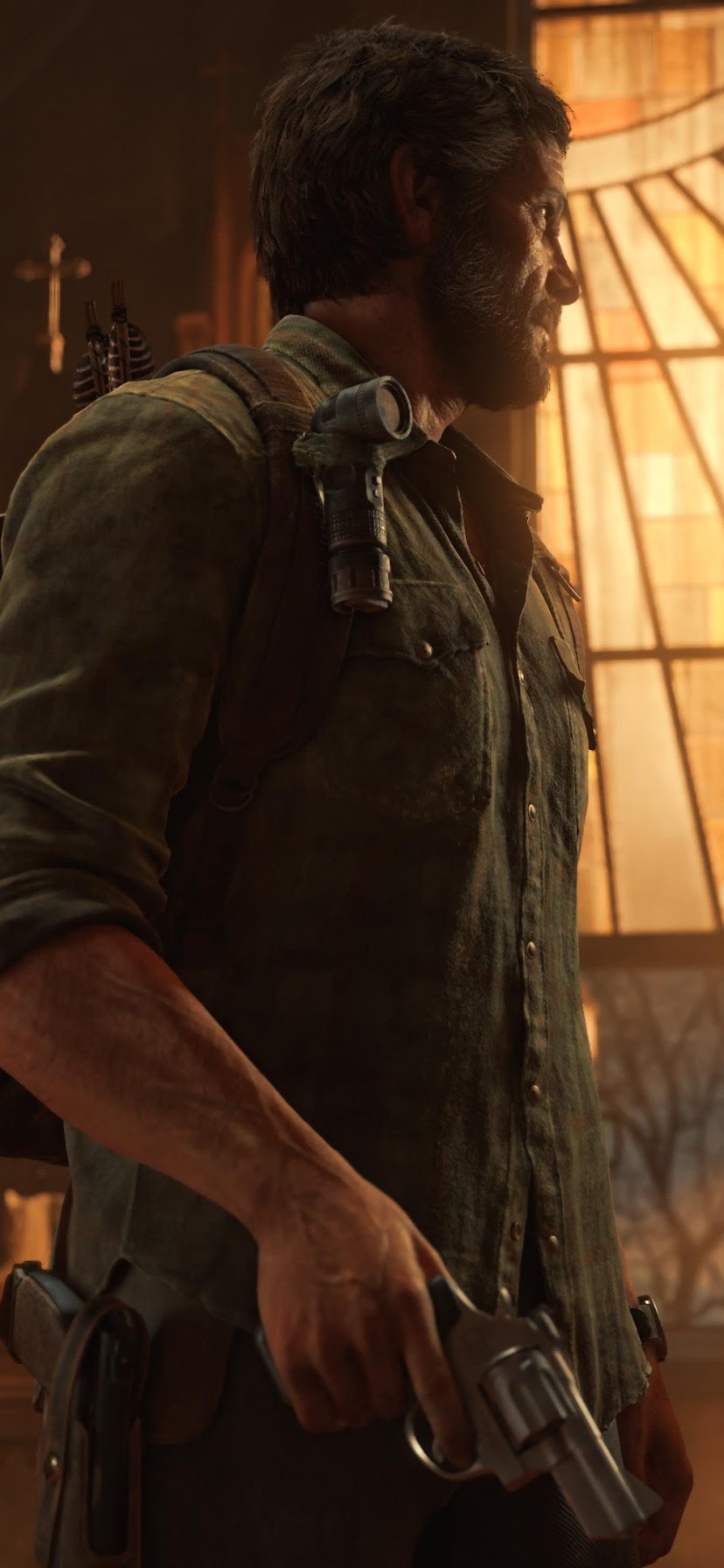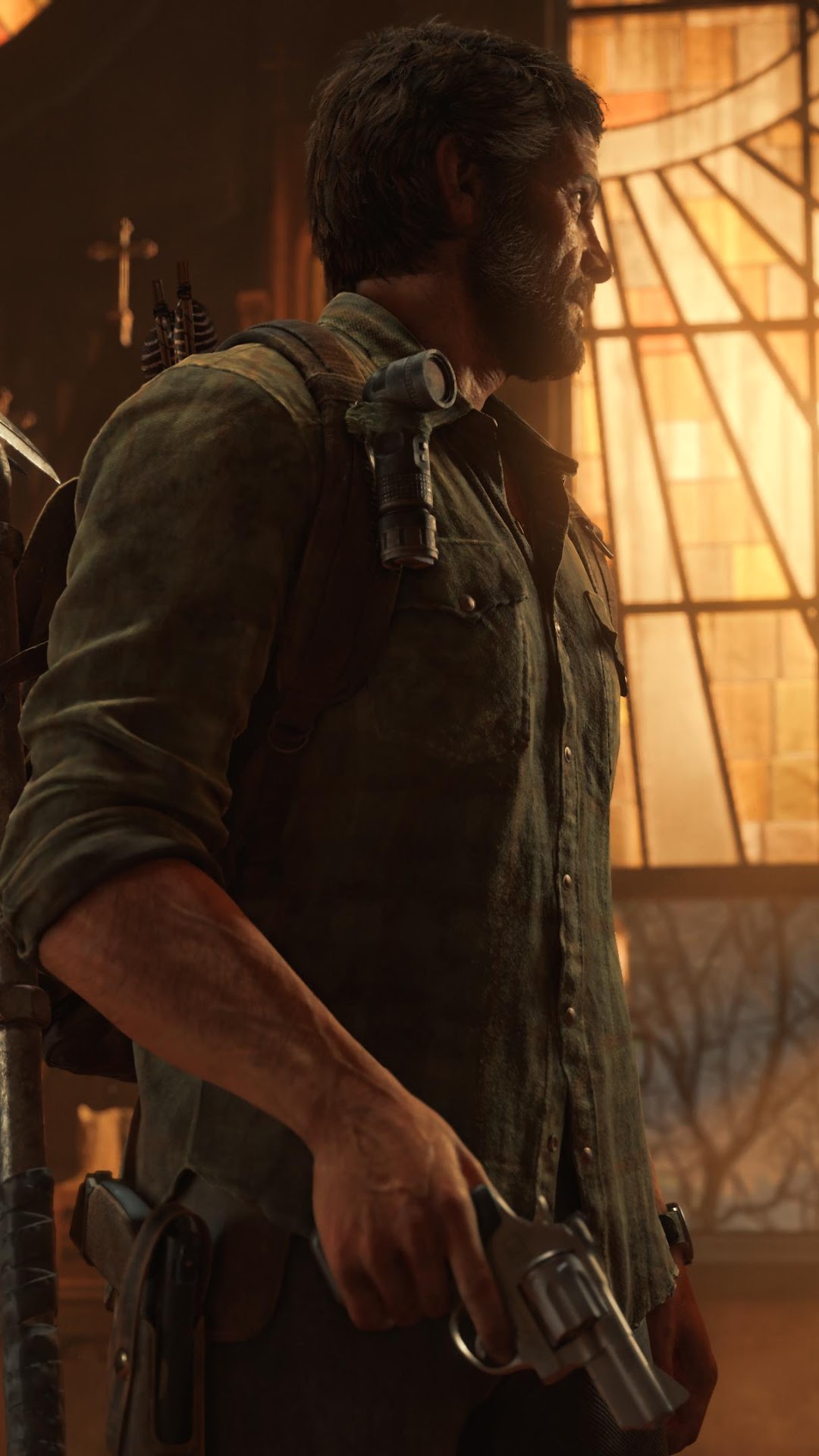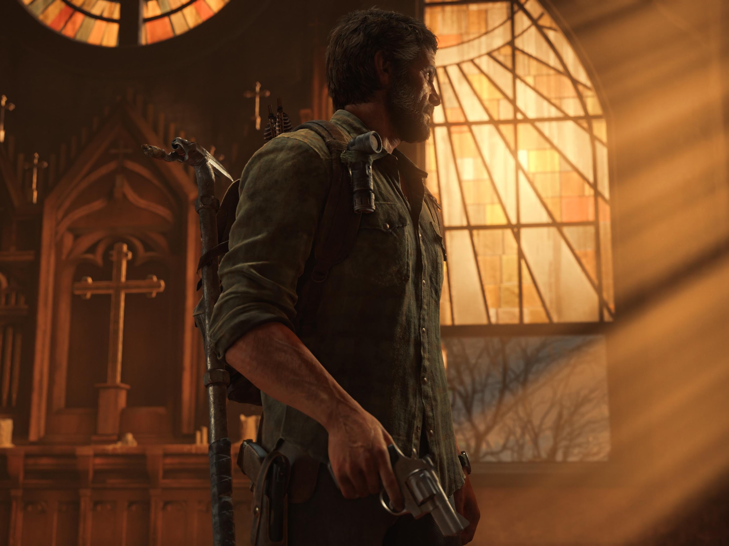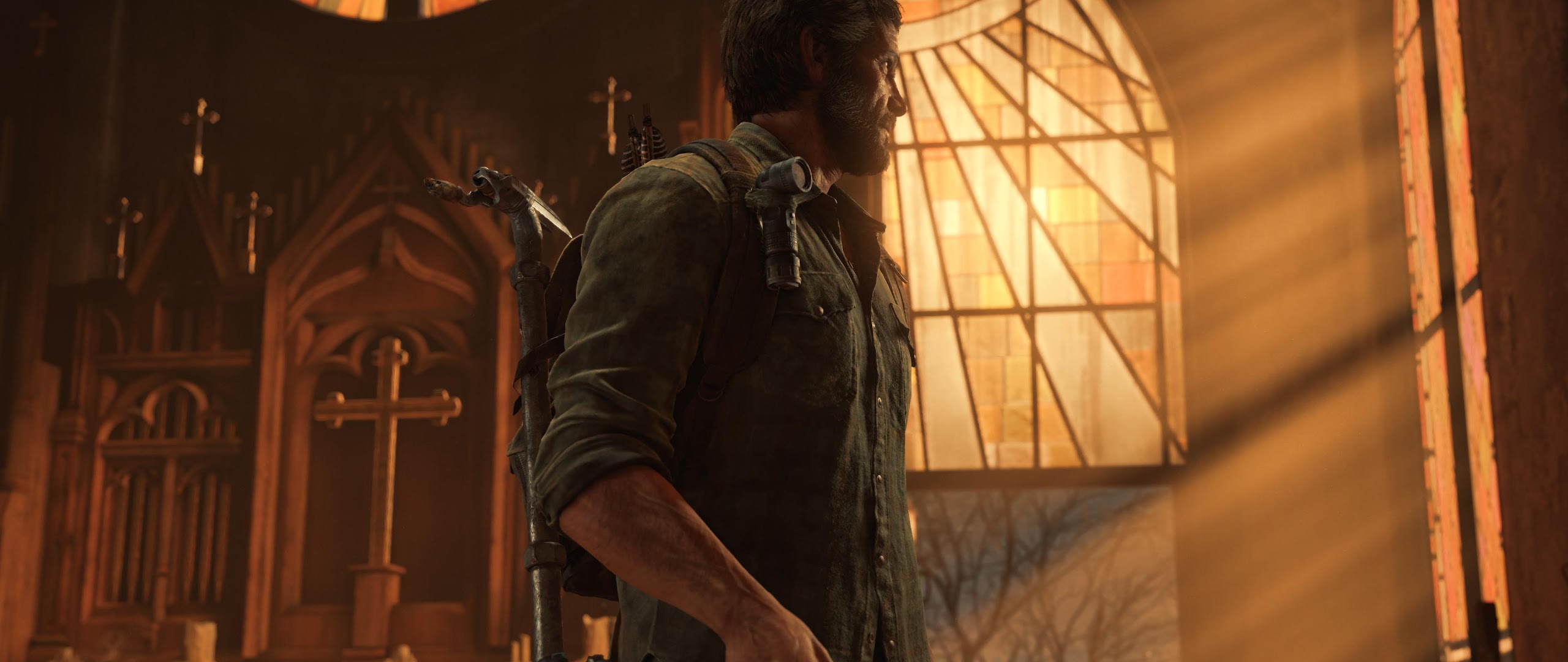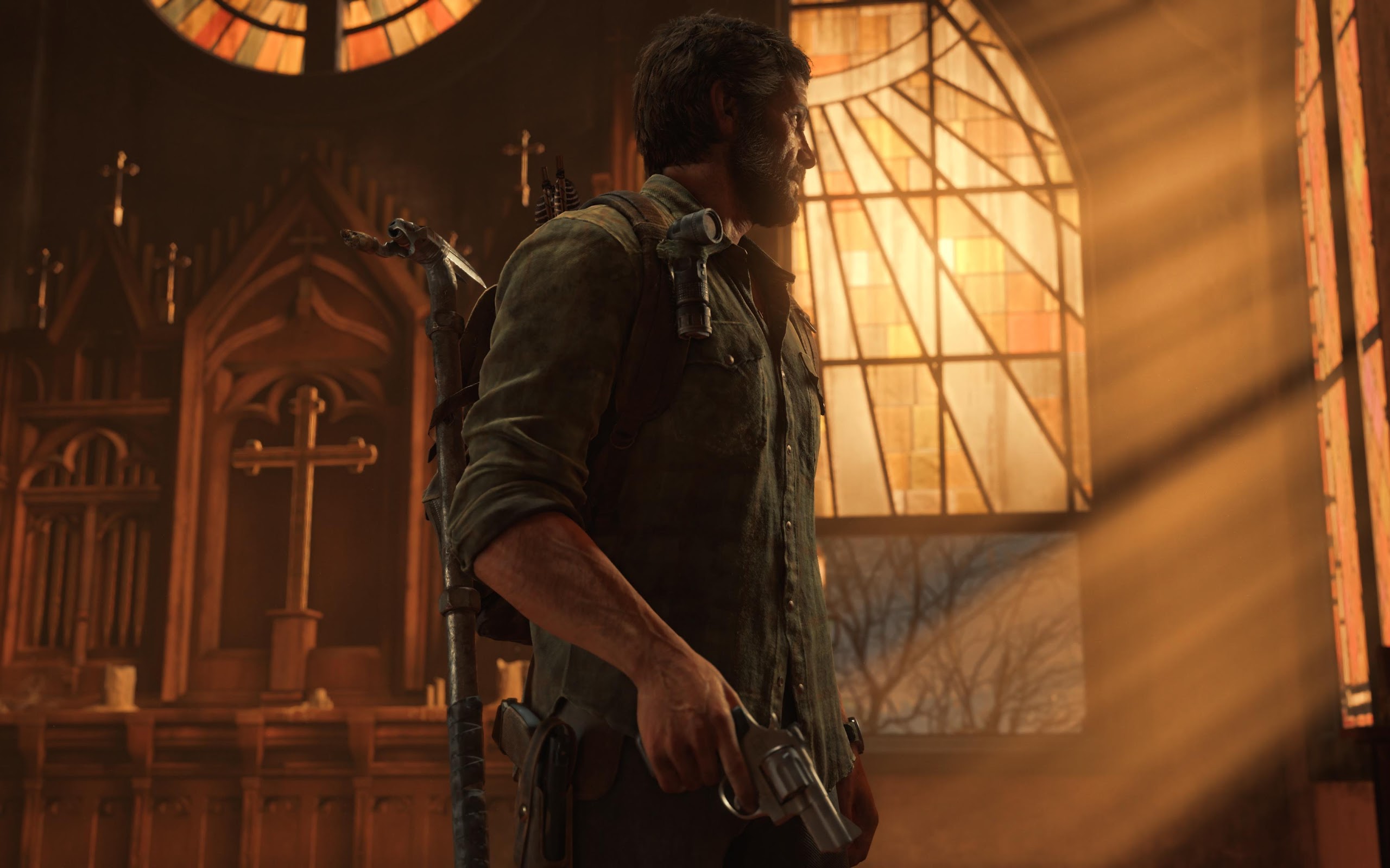 Joel from The Last of Us stands inside a sunlit church holding a revolver with warm light rays streaming through stained glass windows.