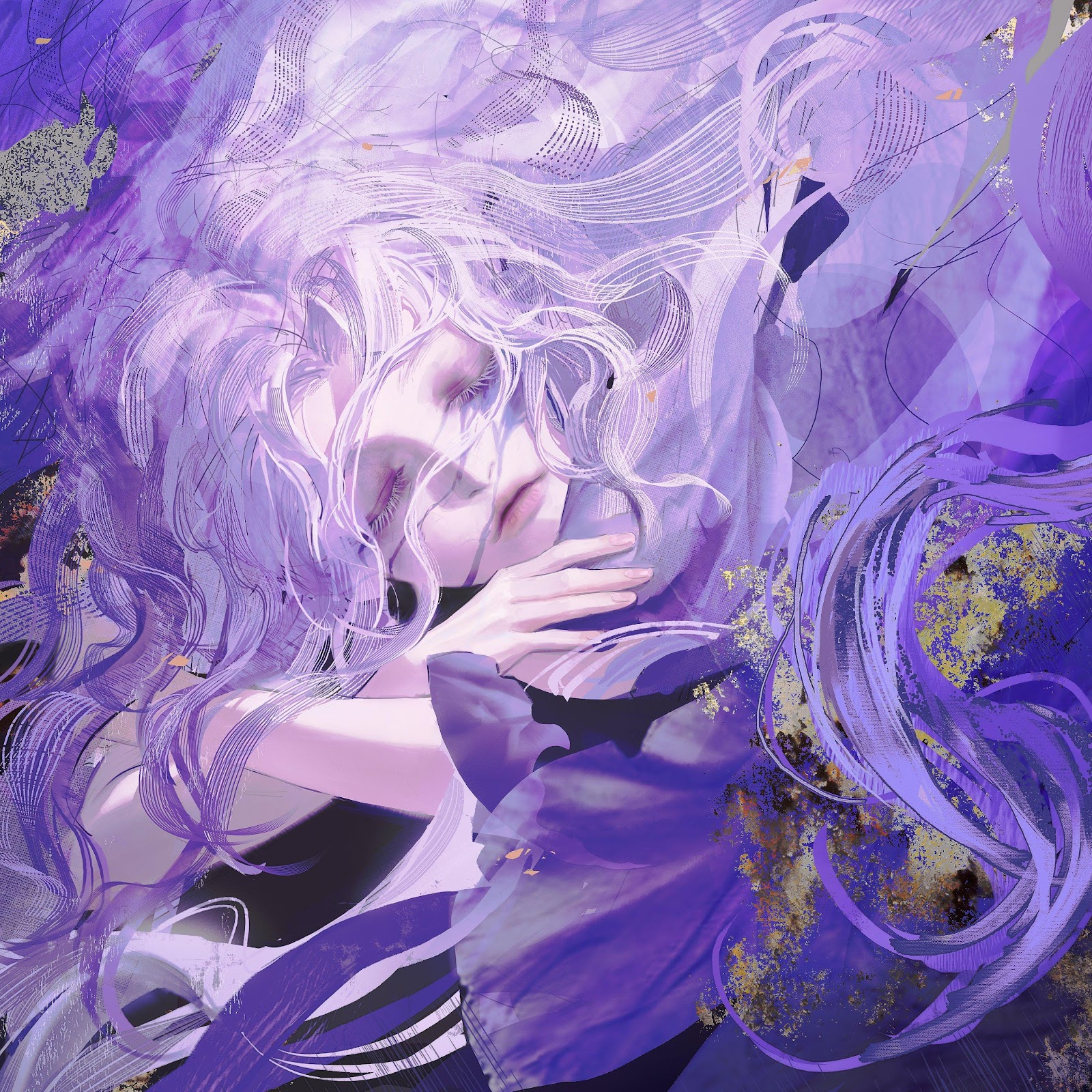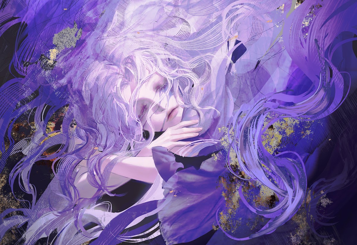 A pale girl with long lavender hair rests peacefully while surrounded by flowing purple waves and golden sparkles in a dreamy digital painting style.