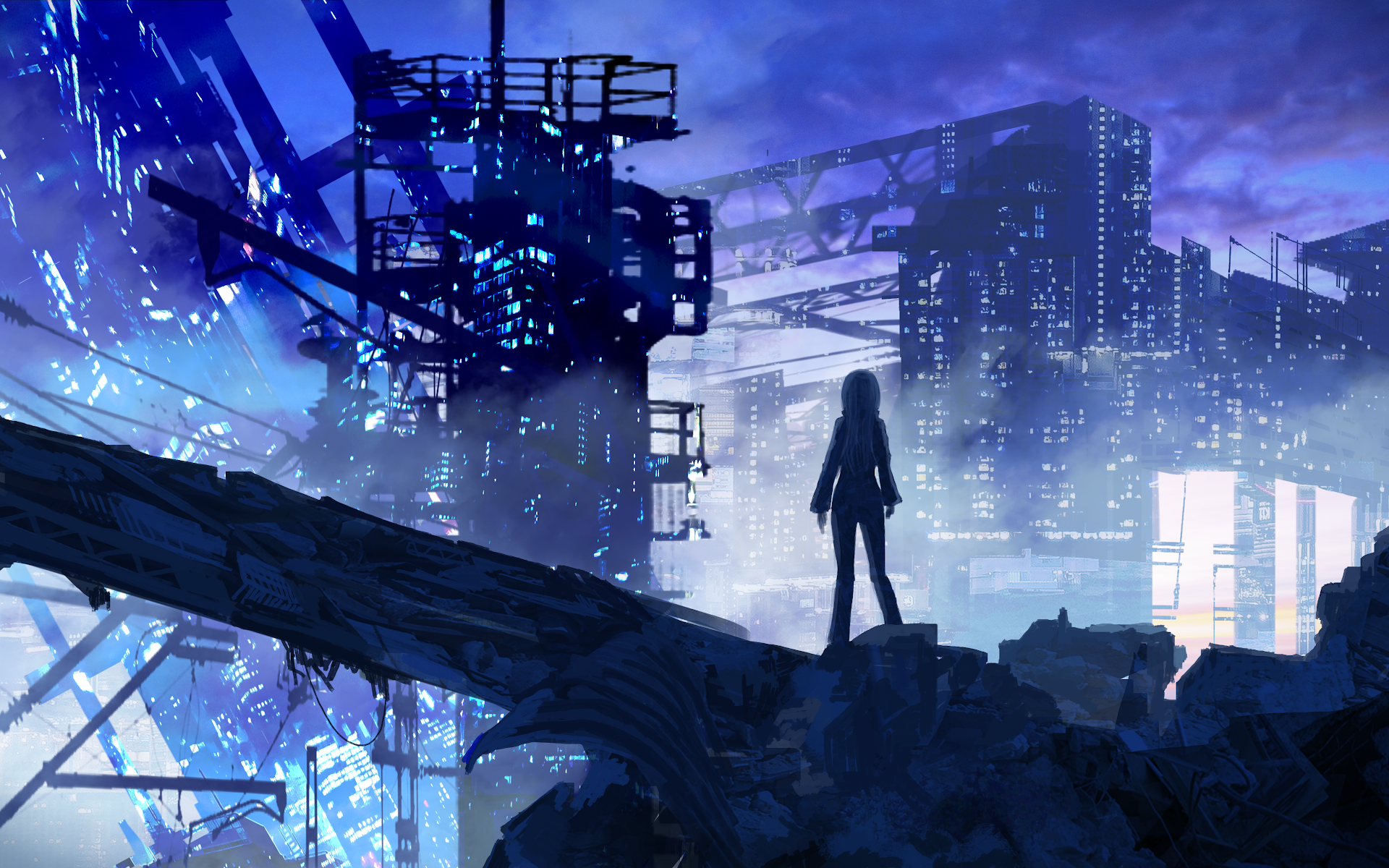 A lone girl stands on a pile of rubble looking at a massive glowing futuristic city with industrial towers and blue lights under a dark sky.
