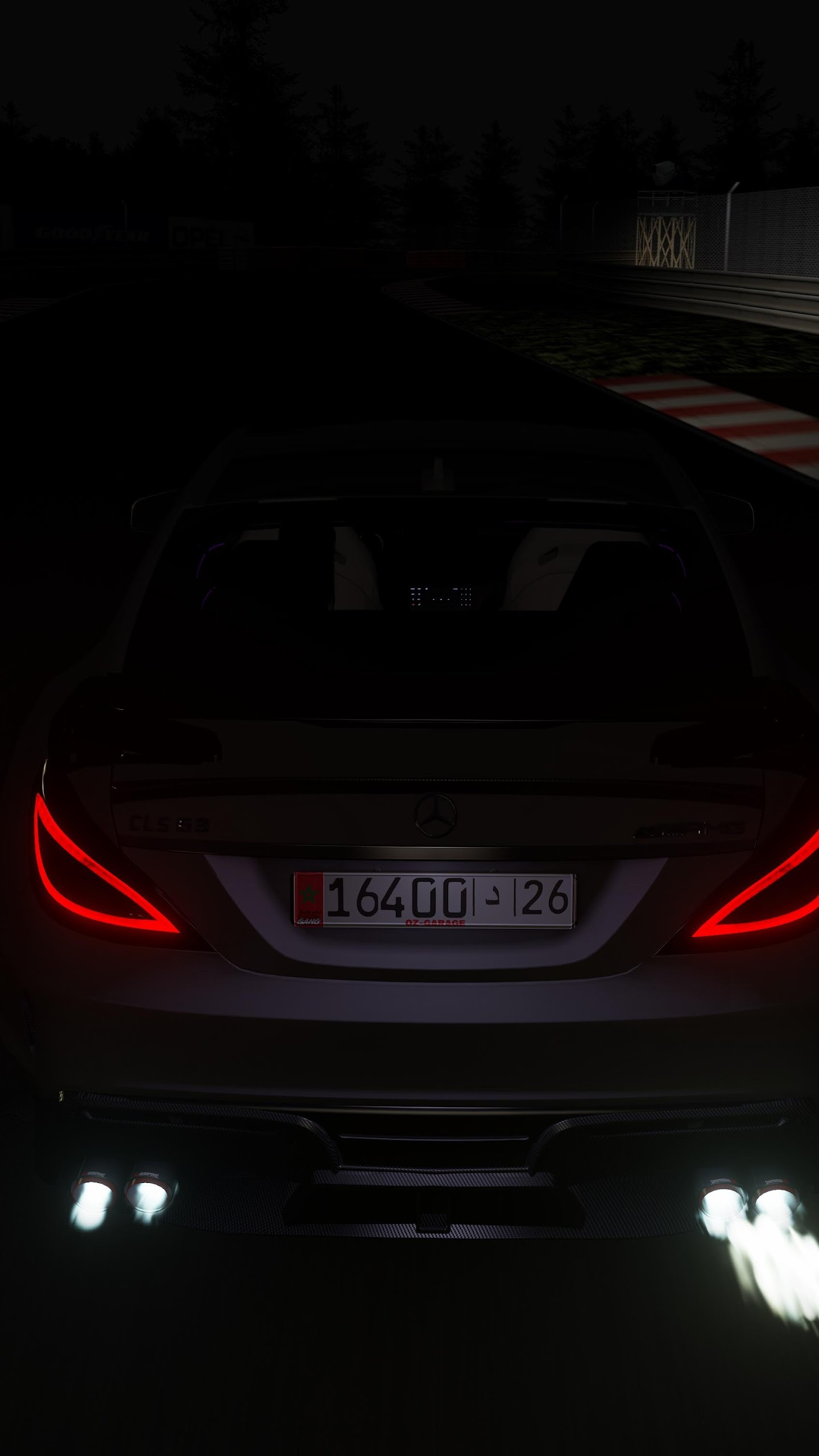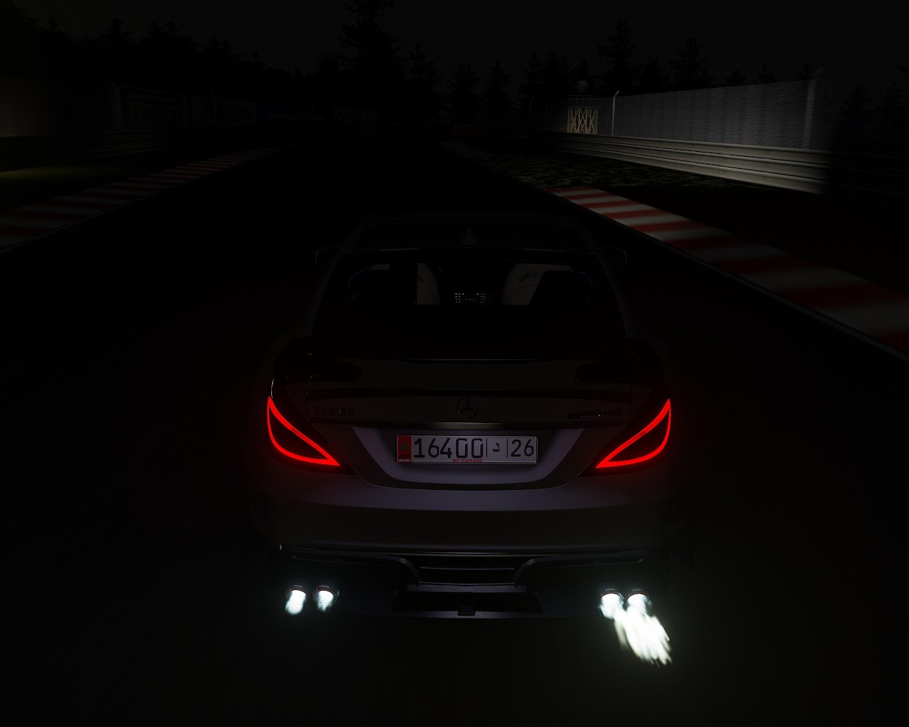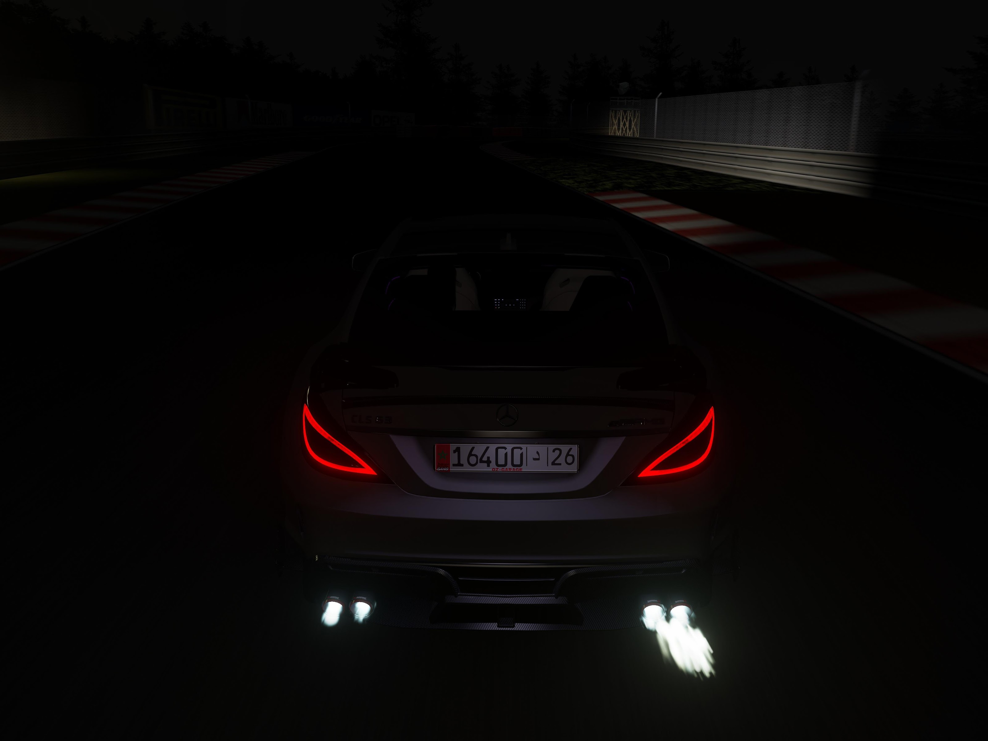 A Mercedes-Benz sports car sits on a dark race track at night with its taillights glowing and white flames spitting from the exhaust.