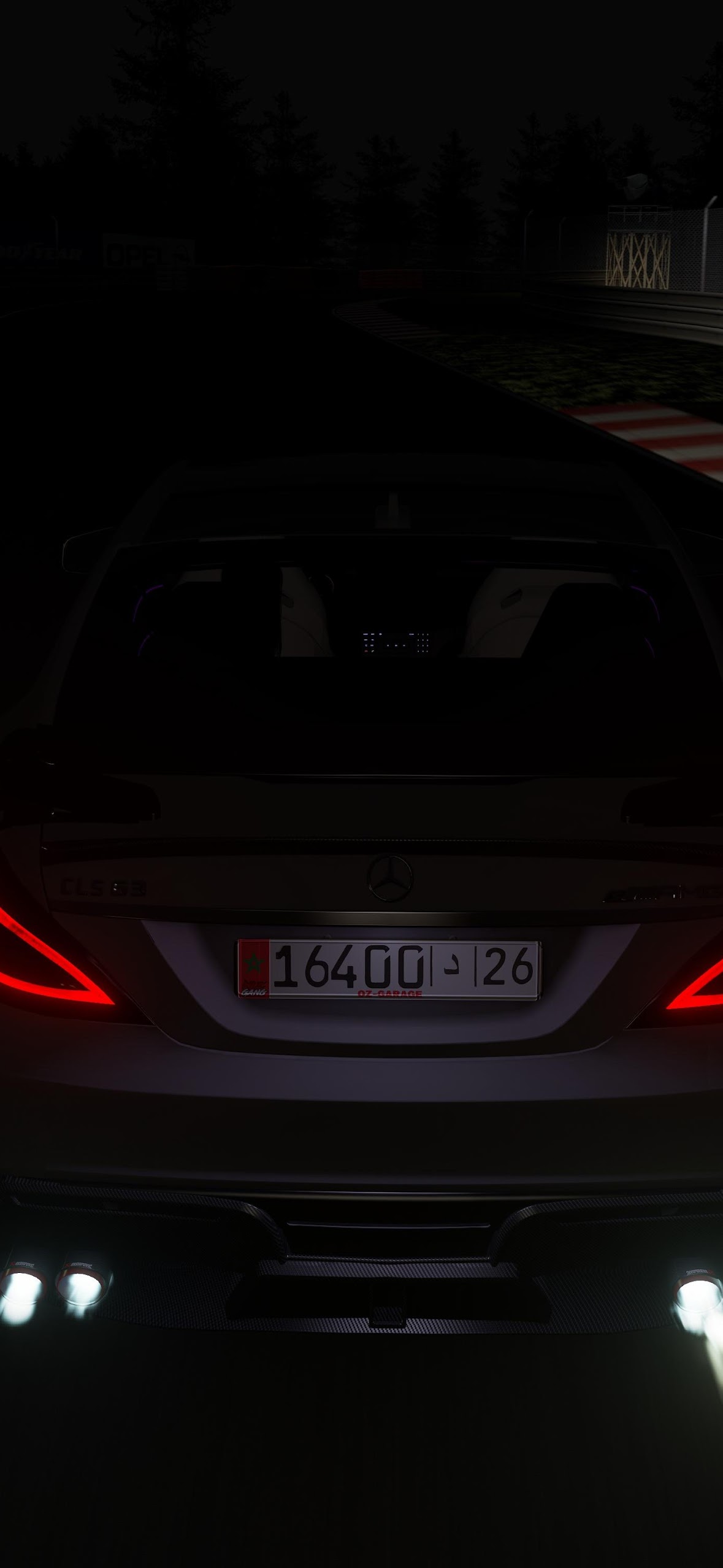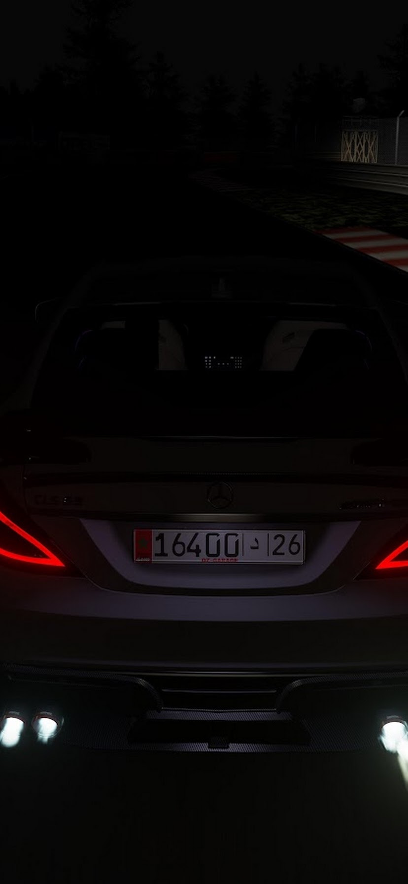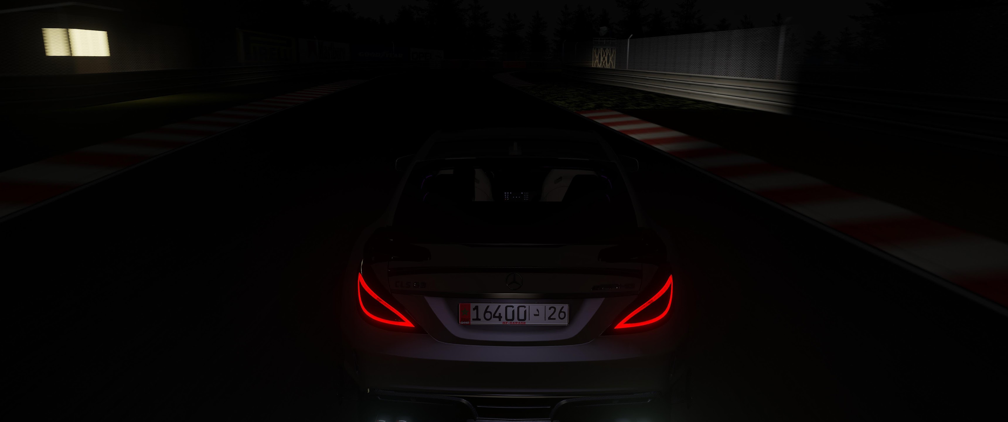 A Mercedes-Benz sports car sits on a dark race track at night with its taillights glowing and white flames spitting from the exhaust.