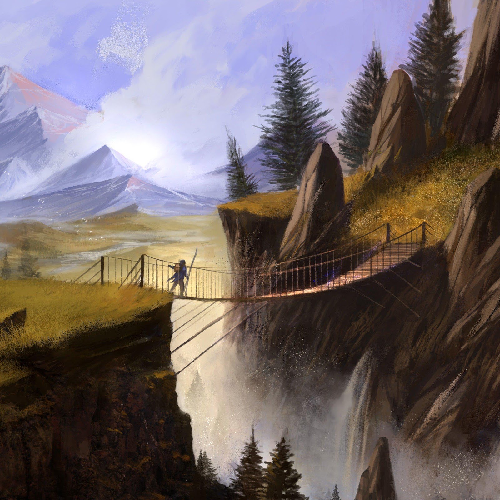 A lone traveler crosses a suspension bridge over a deep chasm with cascading waterfalls and massive snow-capped mountains under a hazy sky in this epic fantasy landscape painting.