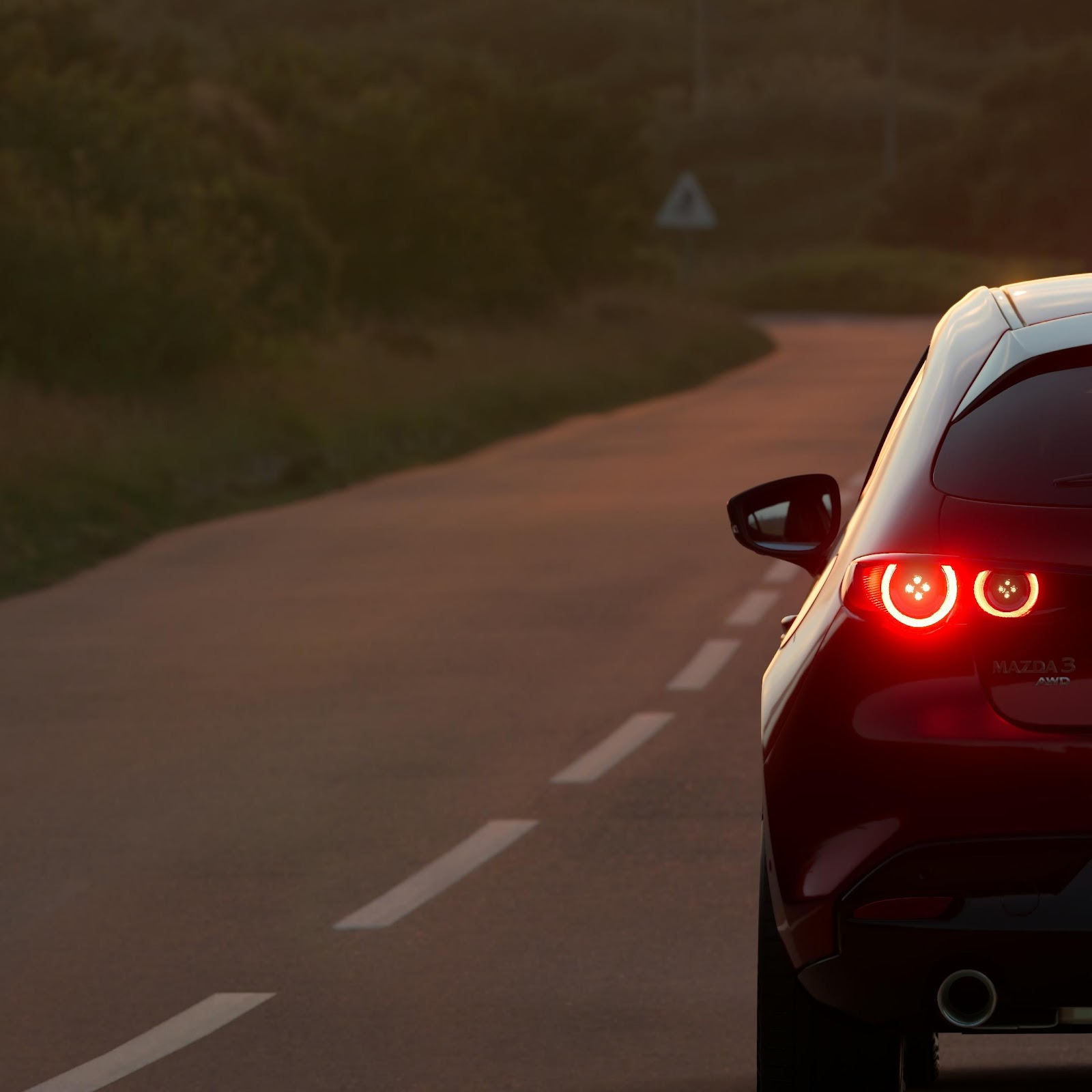 A red Mazda 3 drives along a winding road during sunset showing its glowing round taillights against a warm and cinematic landscape.