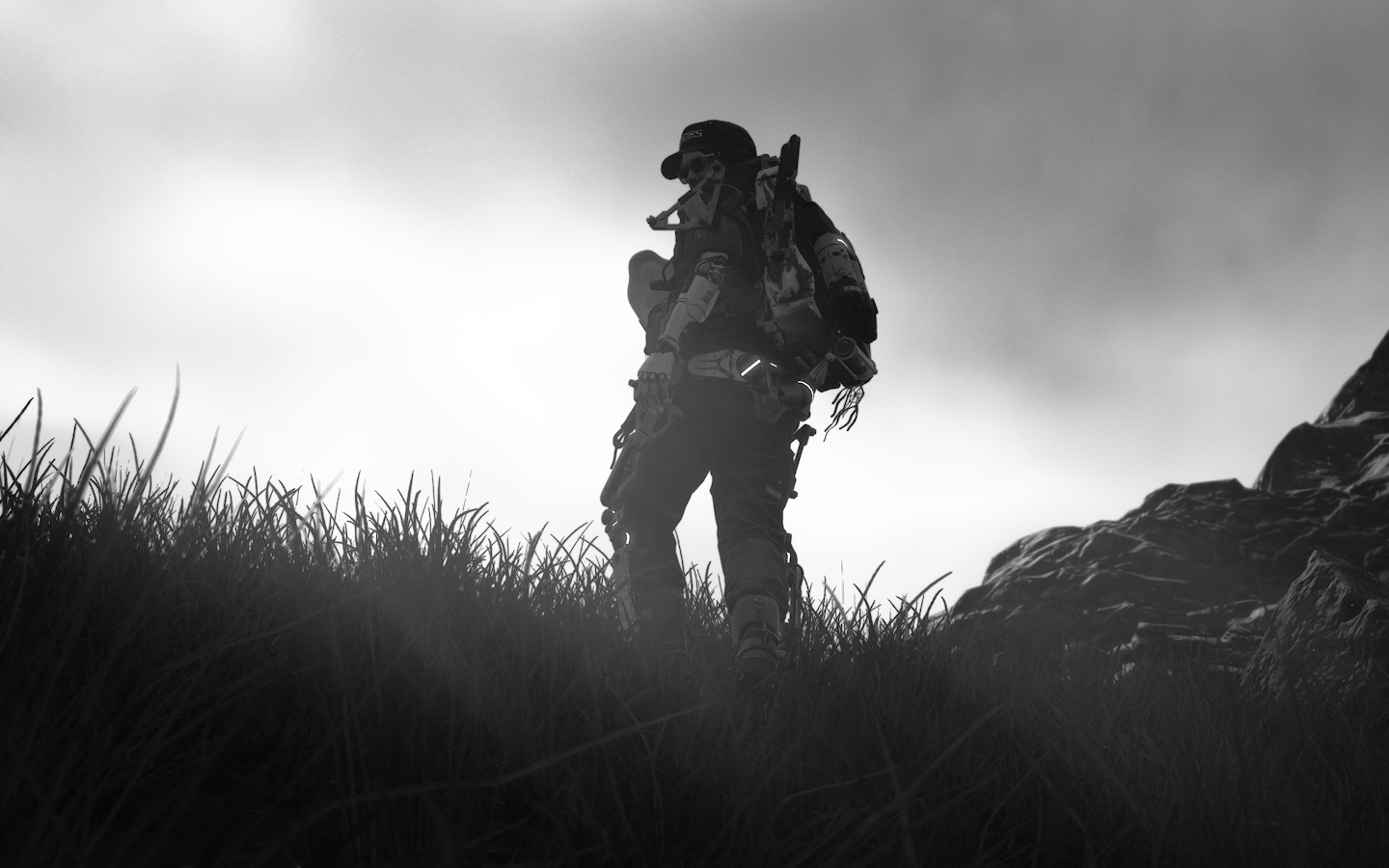 Sam Porter Bridges from Death Stranding stands on a grassy hill with heavy equipment showing a dramatic black and white cinematic vibe.