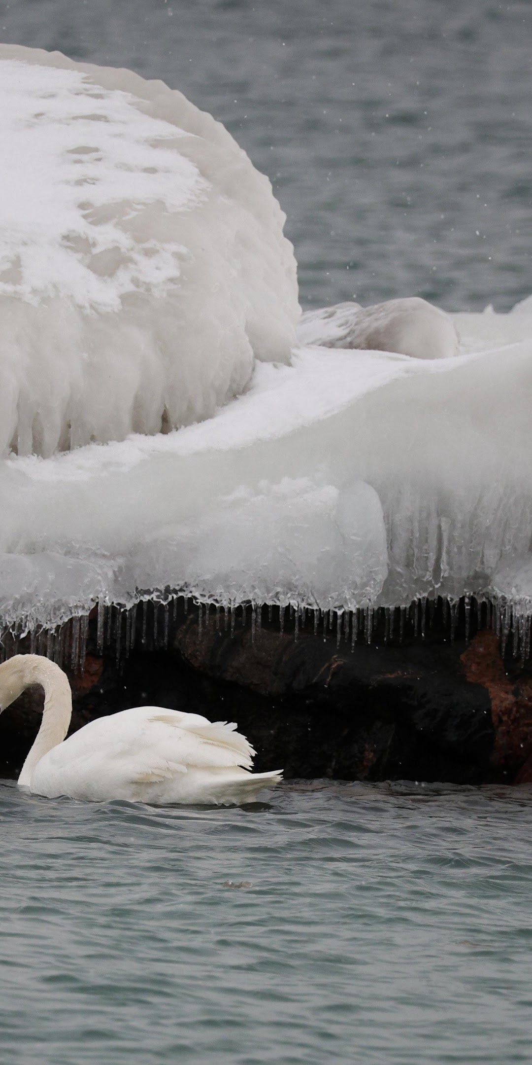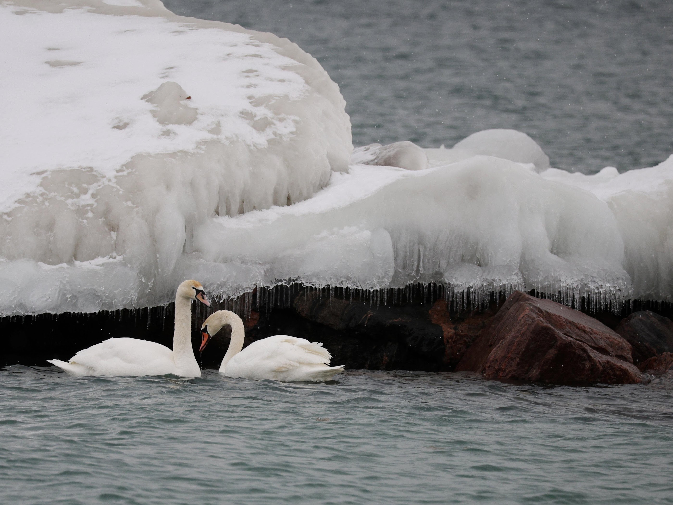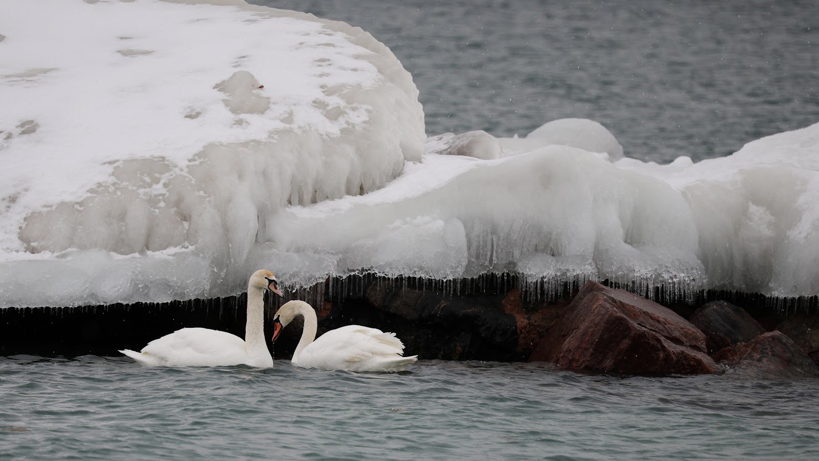 Two elegant white swans swim together in dark water next to a rocky shore covered in thick ice and snow during a cold winter day.