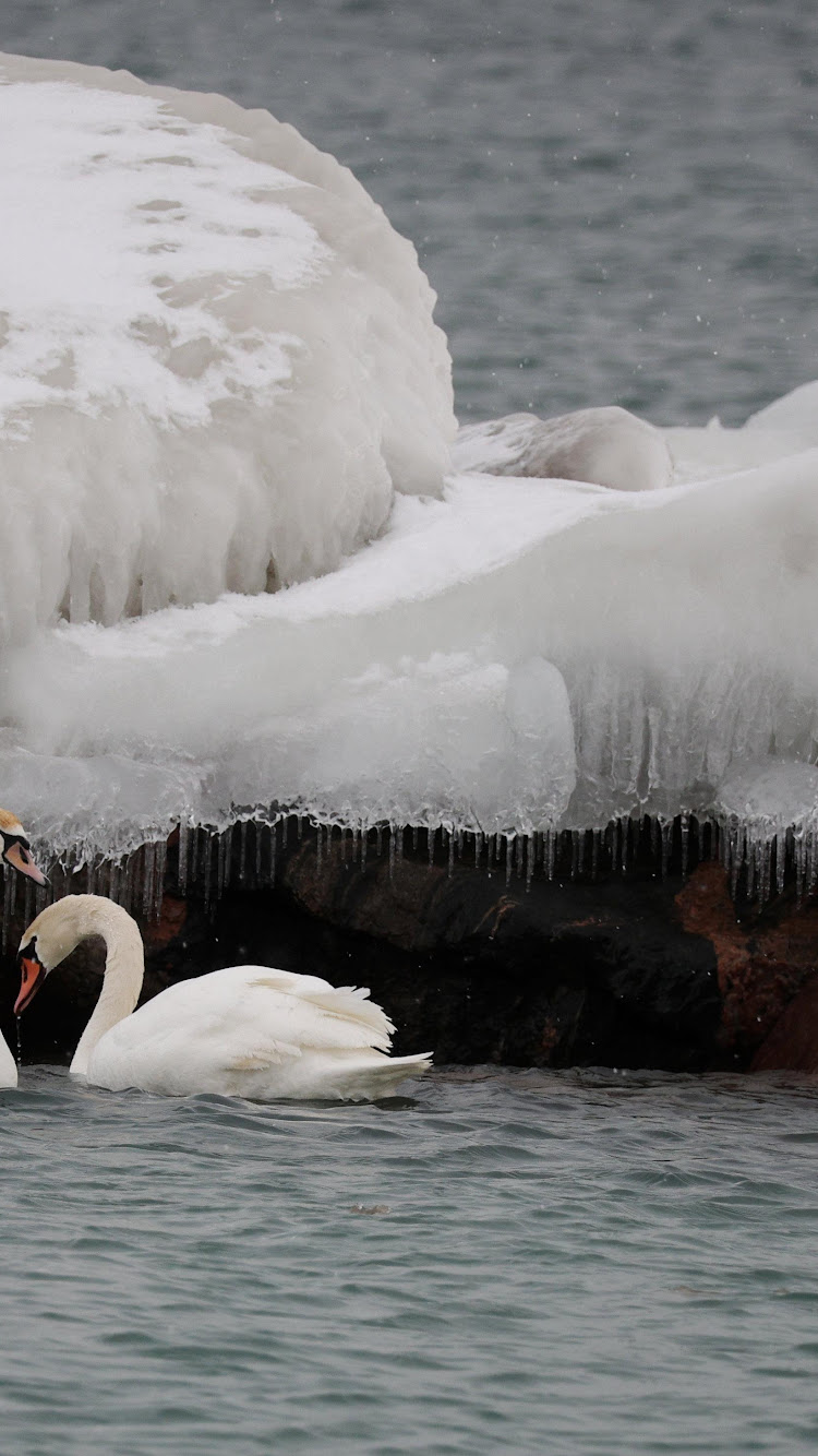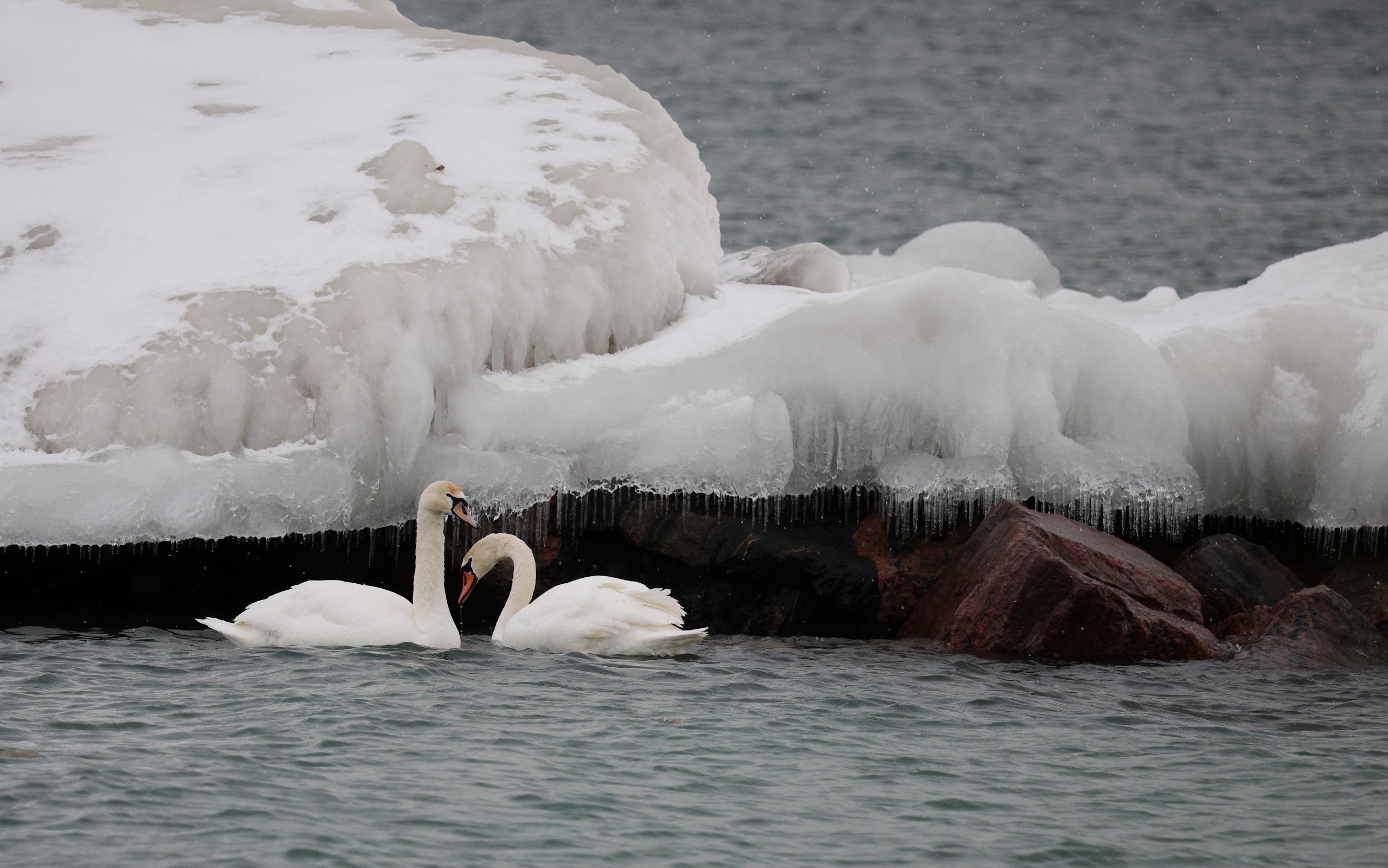 Two White Swans In Winter 4K Desktop Wallpaper