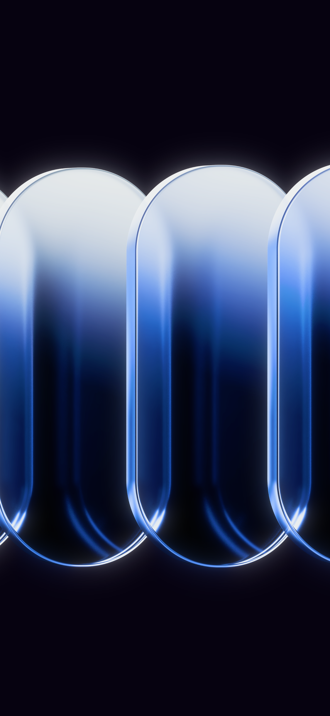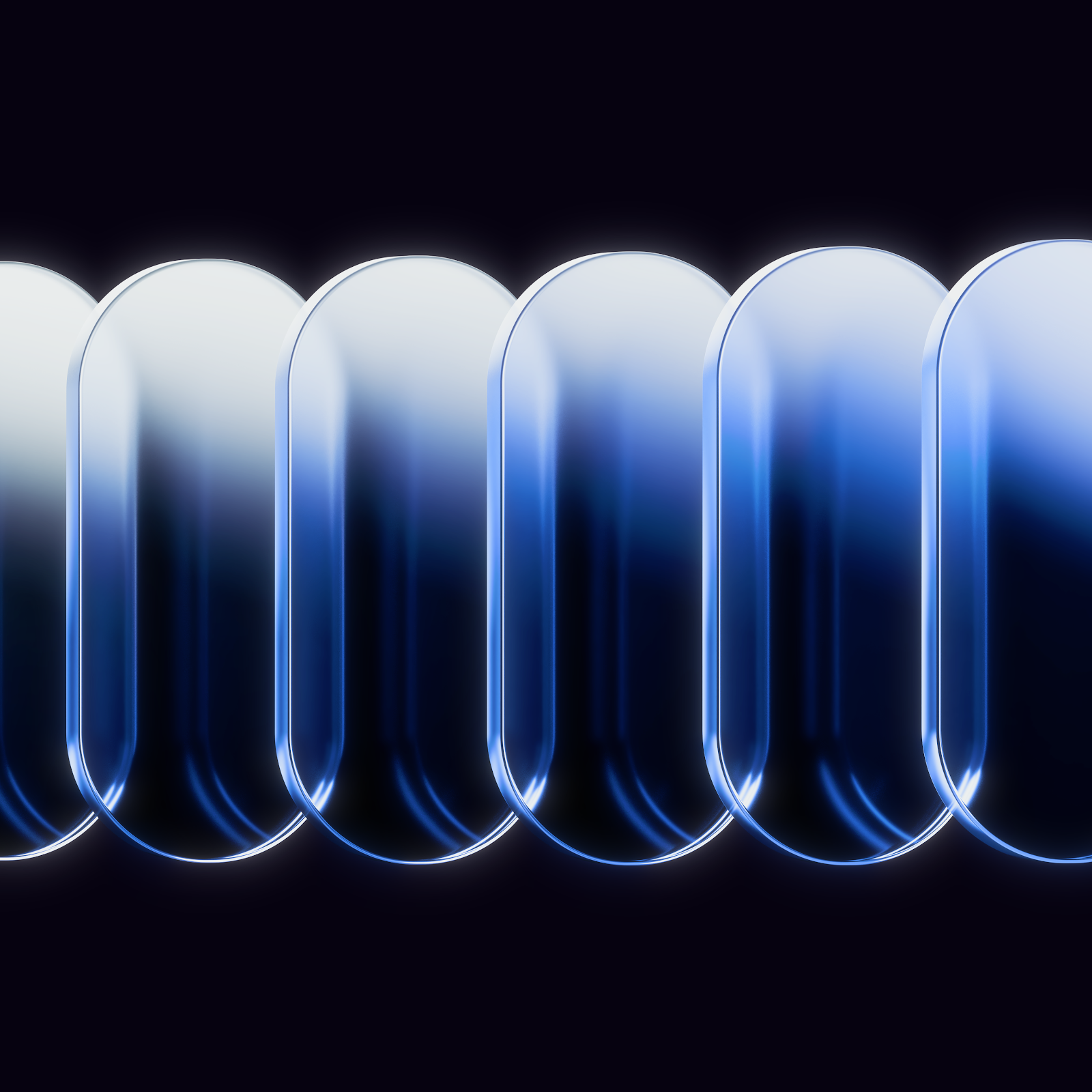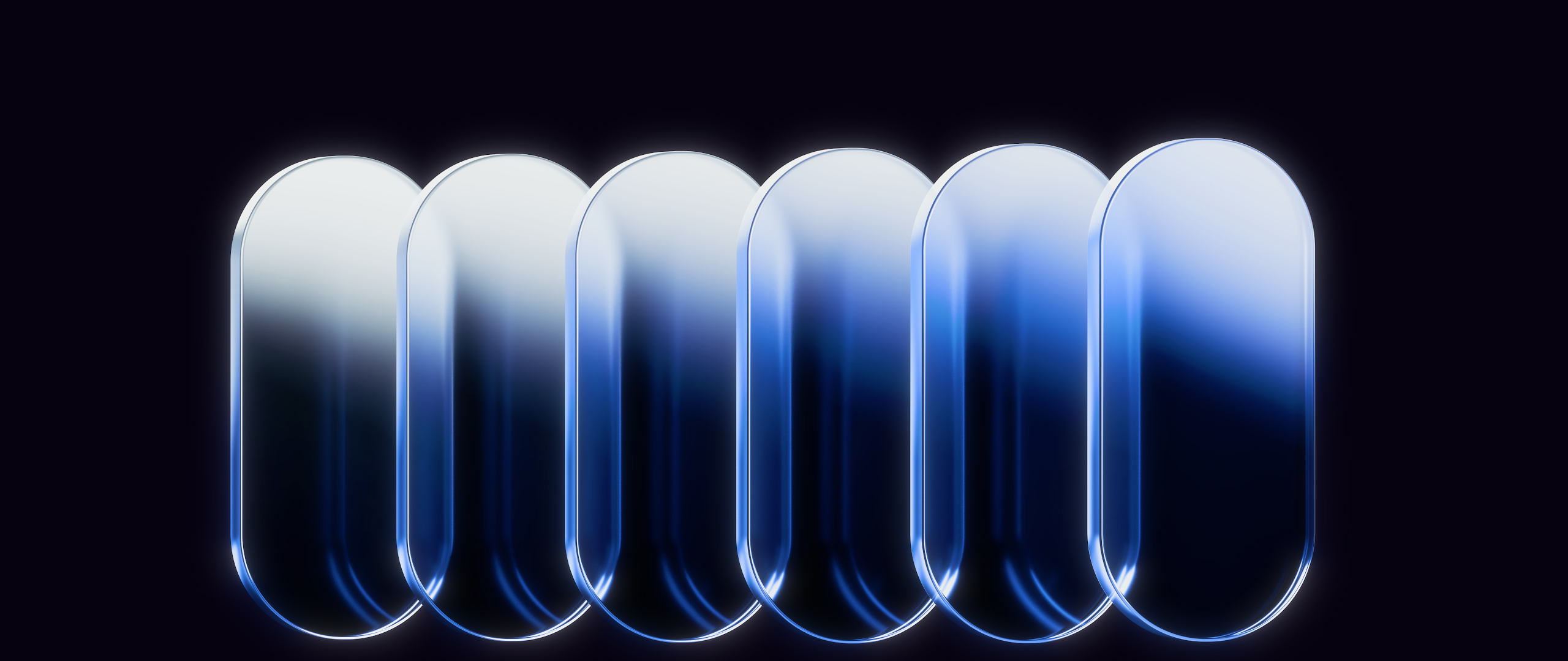 A row of six glossy glass capsules with blue gradients floats against a dark background showing a clean and modern digital art style.