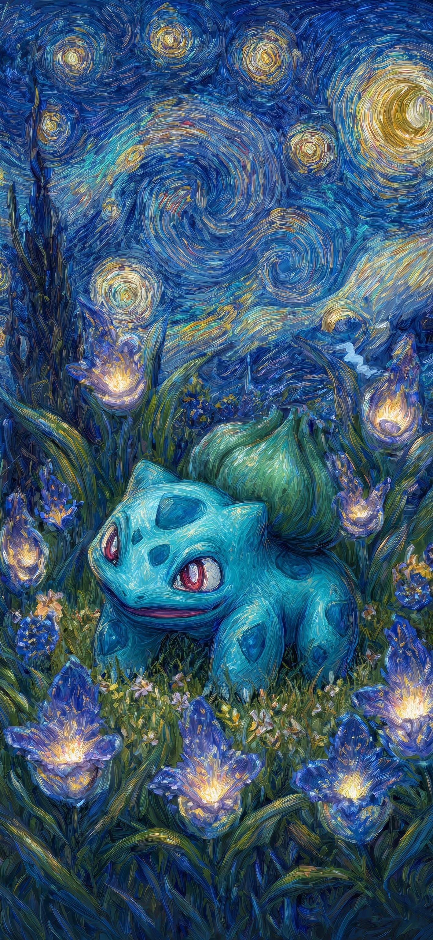 Bulbasaur Under A Starry Night Full HD iPhone Wallpaper Bulbasaur sits in a glowing field of flowers under a swirling night sky with a beautiful impressionist style like a classic Van Gogh painting. fn253 1017.35 KB 1417x3070 Download original File Size: Dimensions: Resolution: Full HD Format: Mobile ID: Blue Bulbasaur Fantasy Painting Impressionism Pokémon Starry Night Van Gogh Style