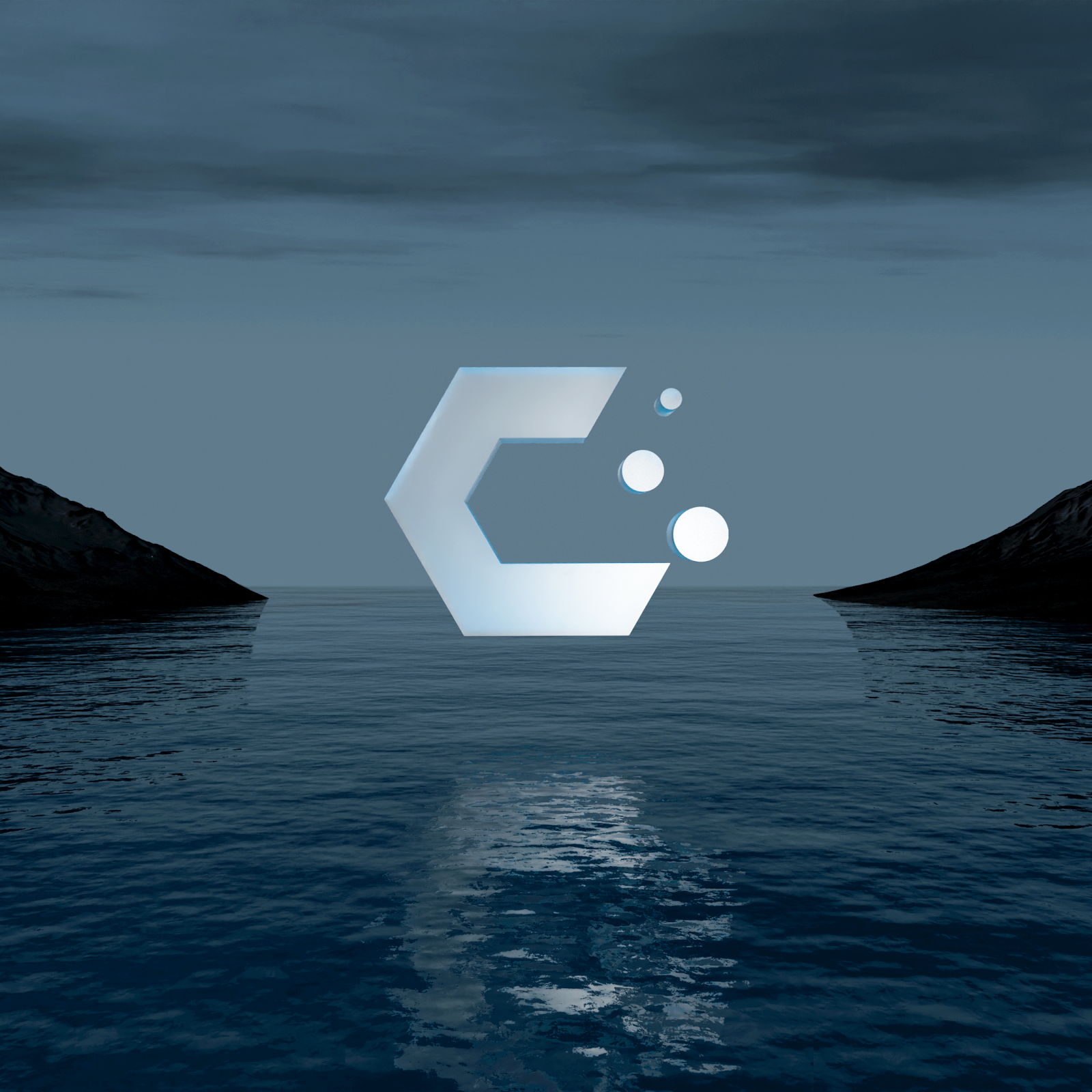 A white Commodore logo floats above a calm dark blue ocean between two rocky mountains under a cloudy sky in this clean digital art style.