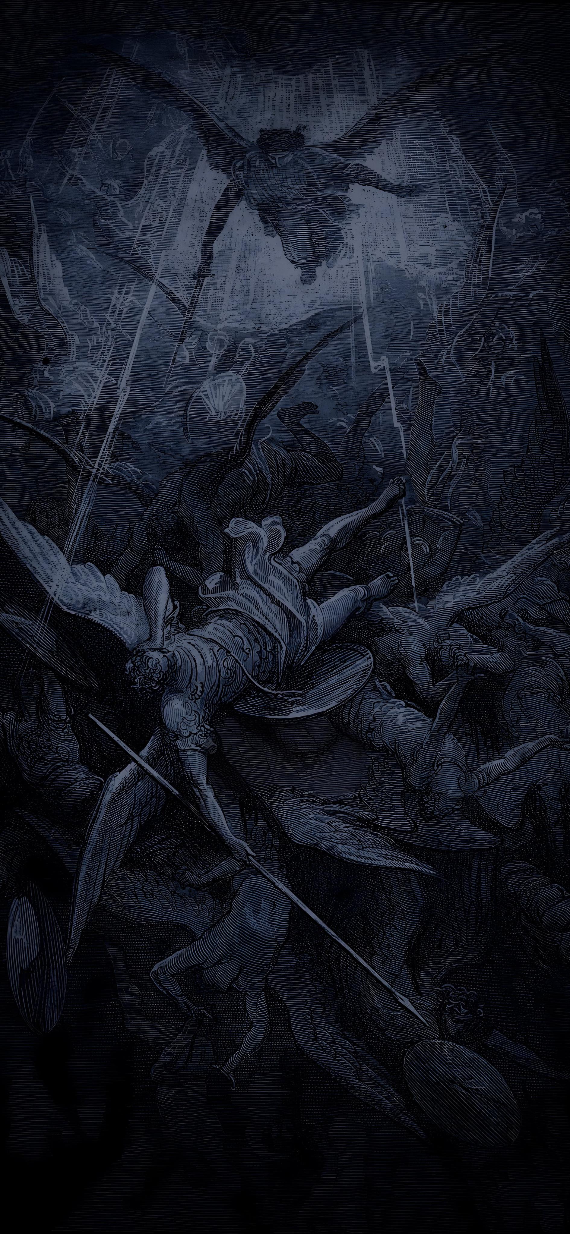 Fall Of The Rebel Angels 2K iPhone Wallpaper Archangel Michael casts down rebellious angels into a dark abyss showing a moody classical engraving style with deep blue tones. bg598 1.37 MB 1890x4094 Download original File Size: Dimensions: Resolution: 2K Format: Mobile ID: Biblical Art Blue Classical Art Engraving Fallen Angels Gustave Dore Paradise Lost