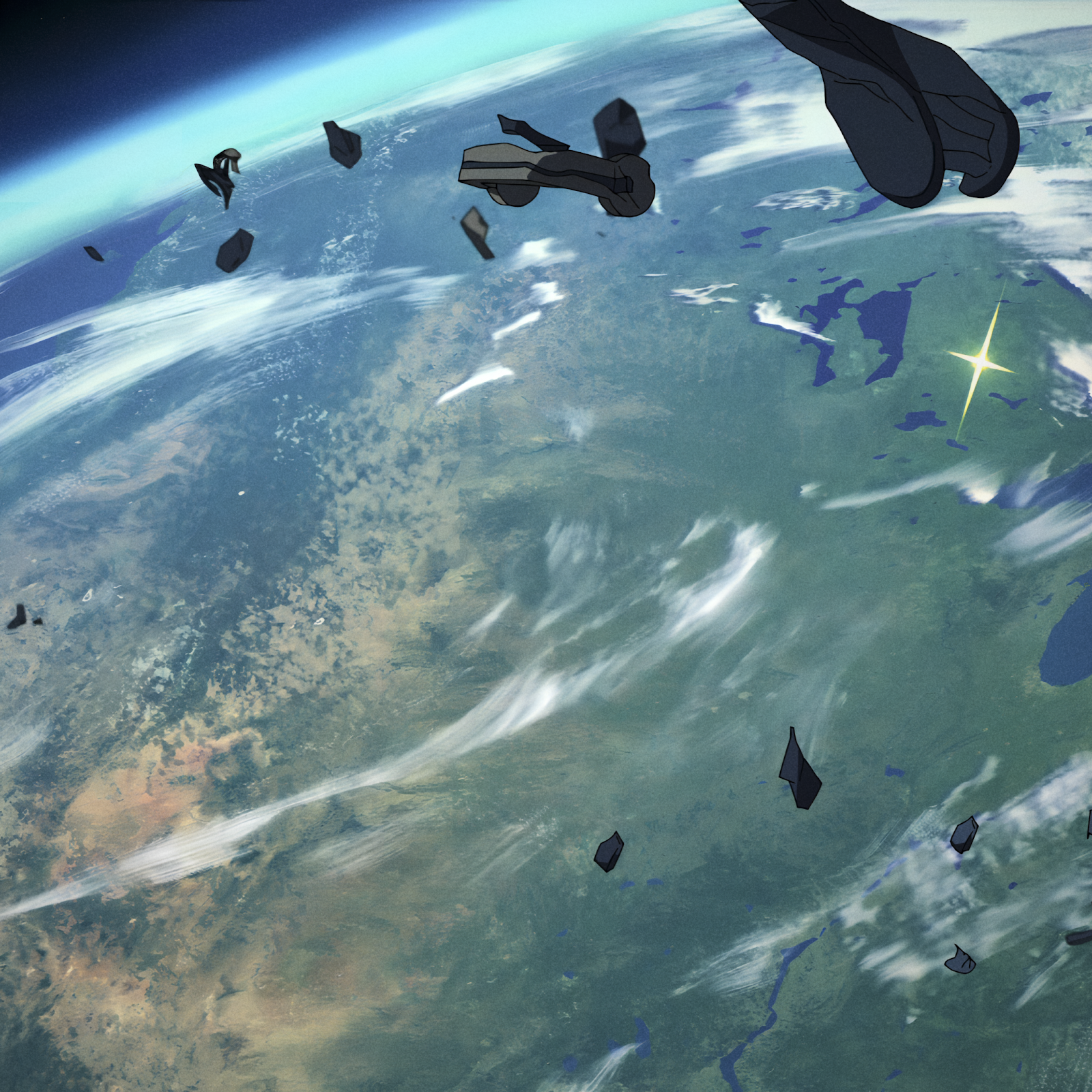 Invincible floats in outer space while looking down at the green and blue Earth with dark debris scattered across the atmosphere in this animated scene.