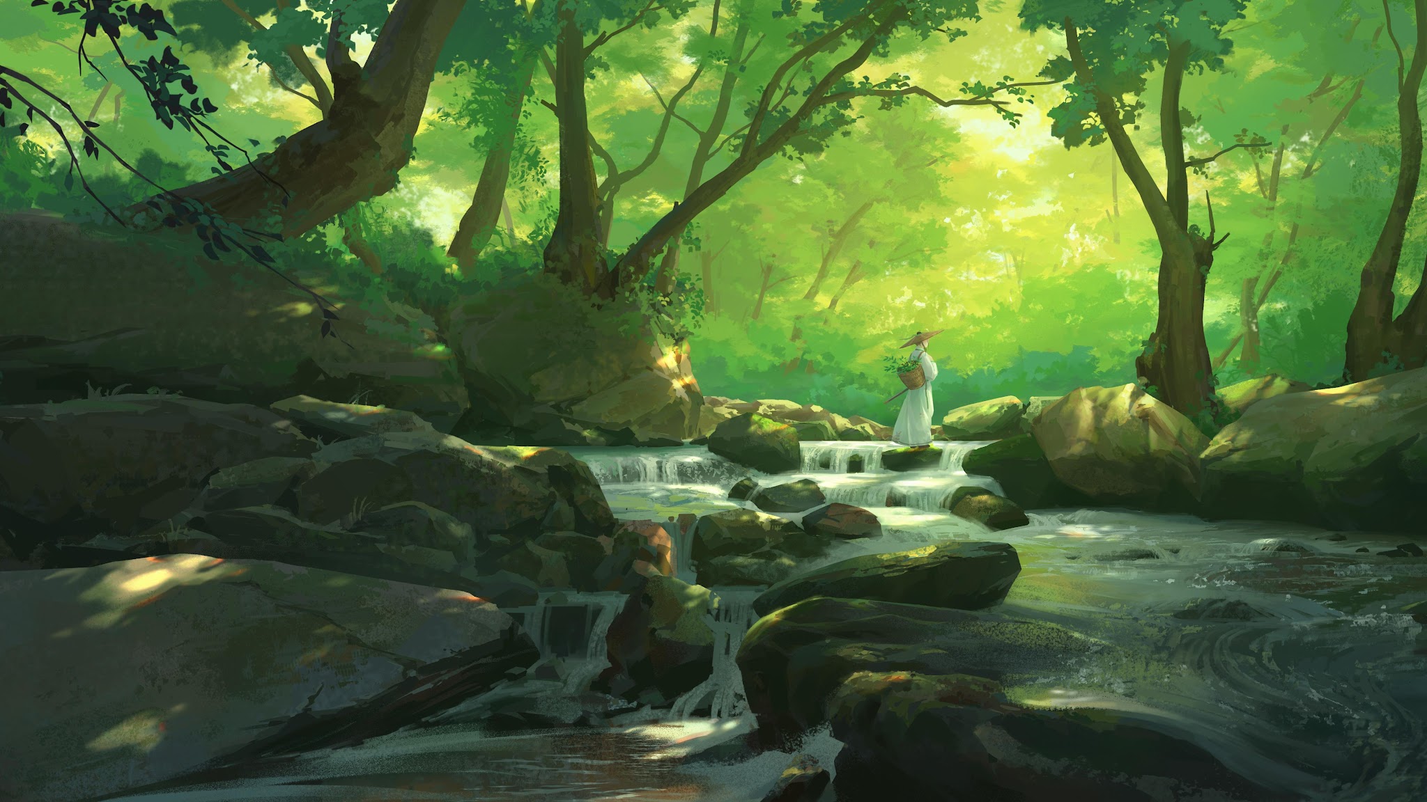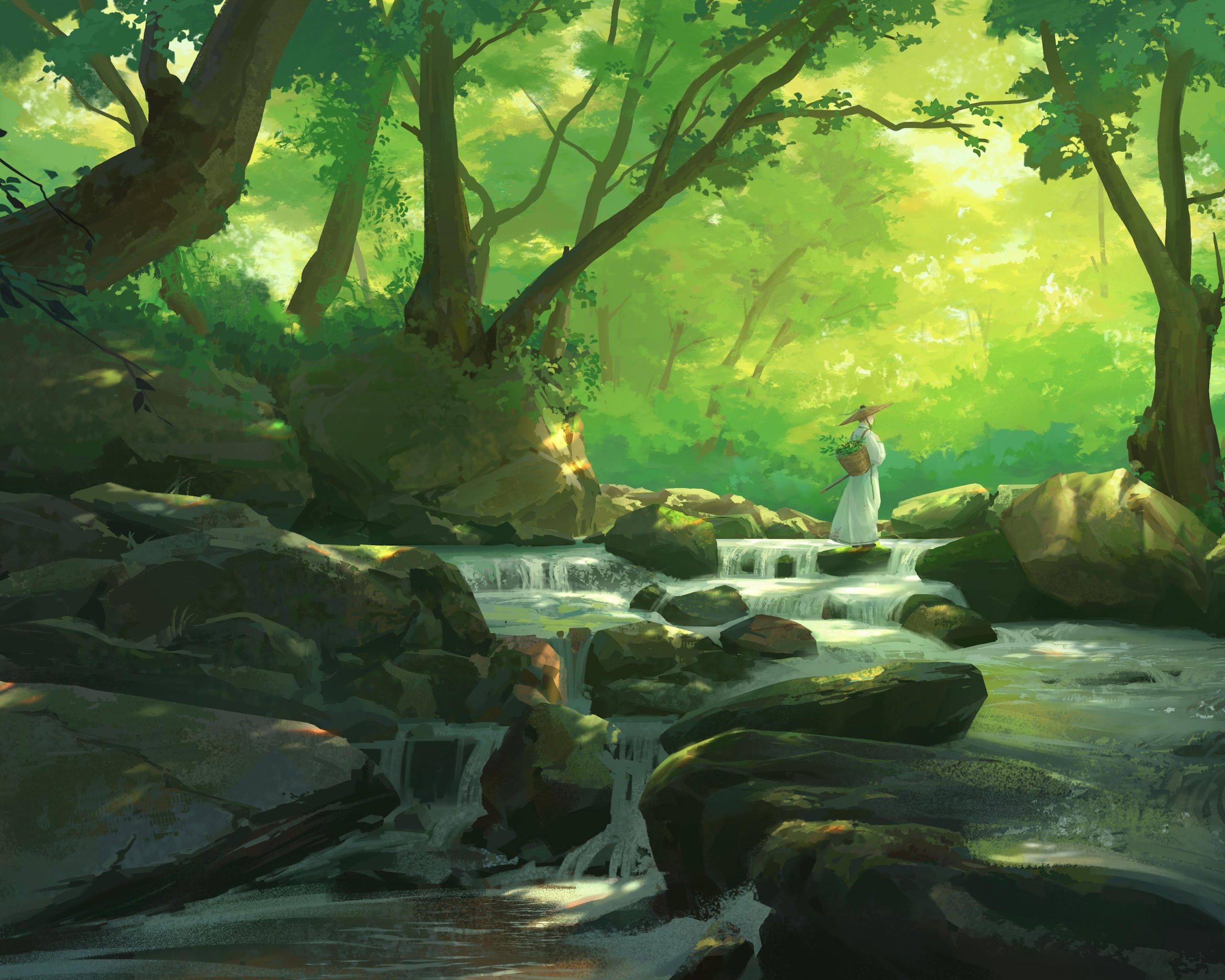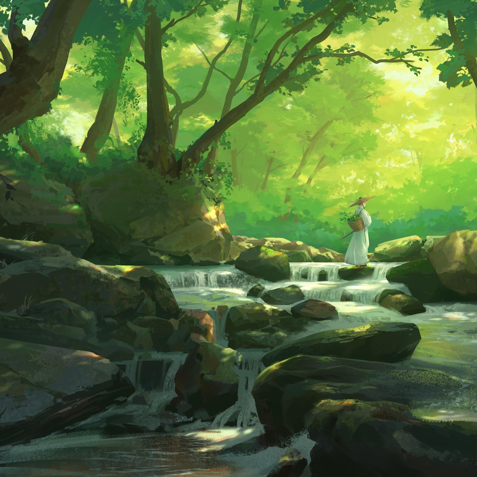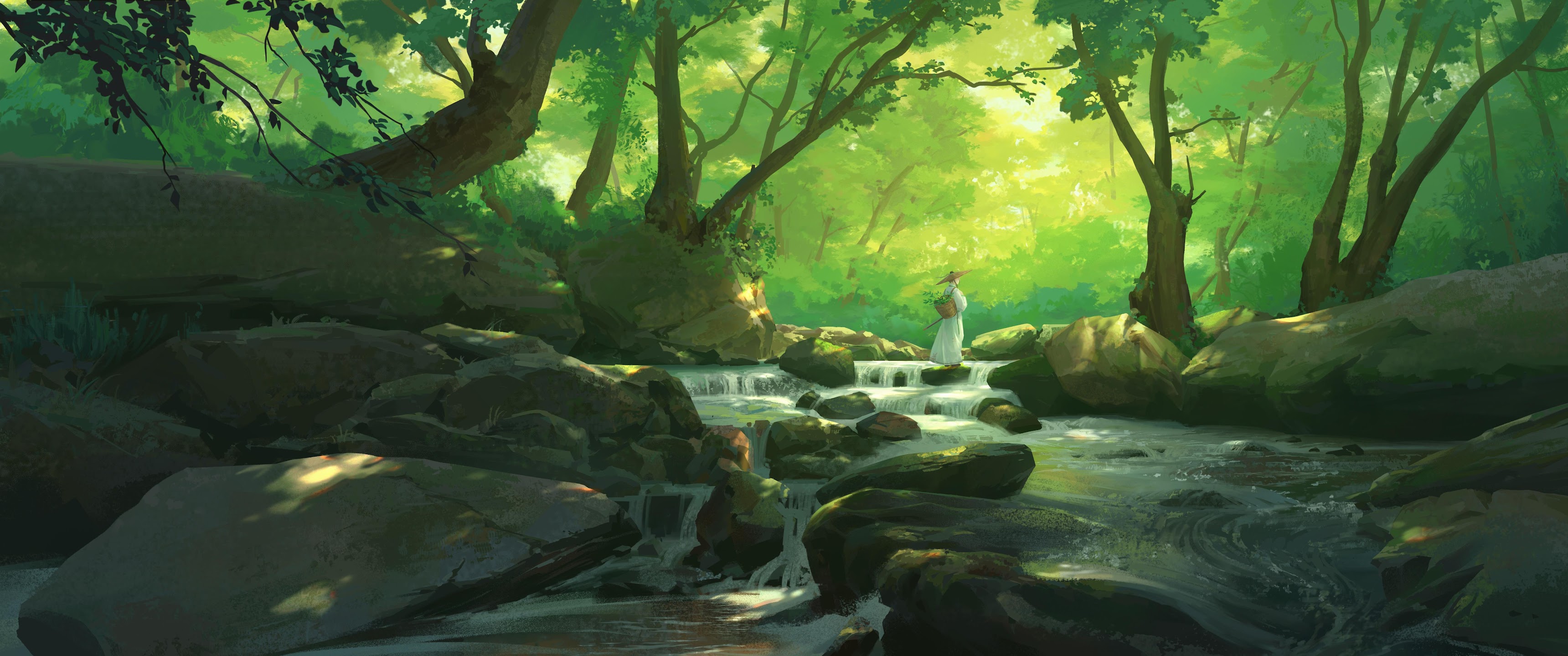 A lone traveler in white robes stands on mossy rocks in a vibrant green forest stream with sunlight shining through the trees.