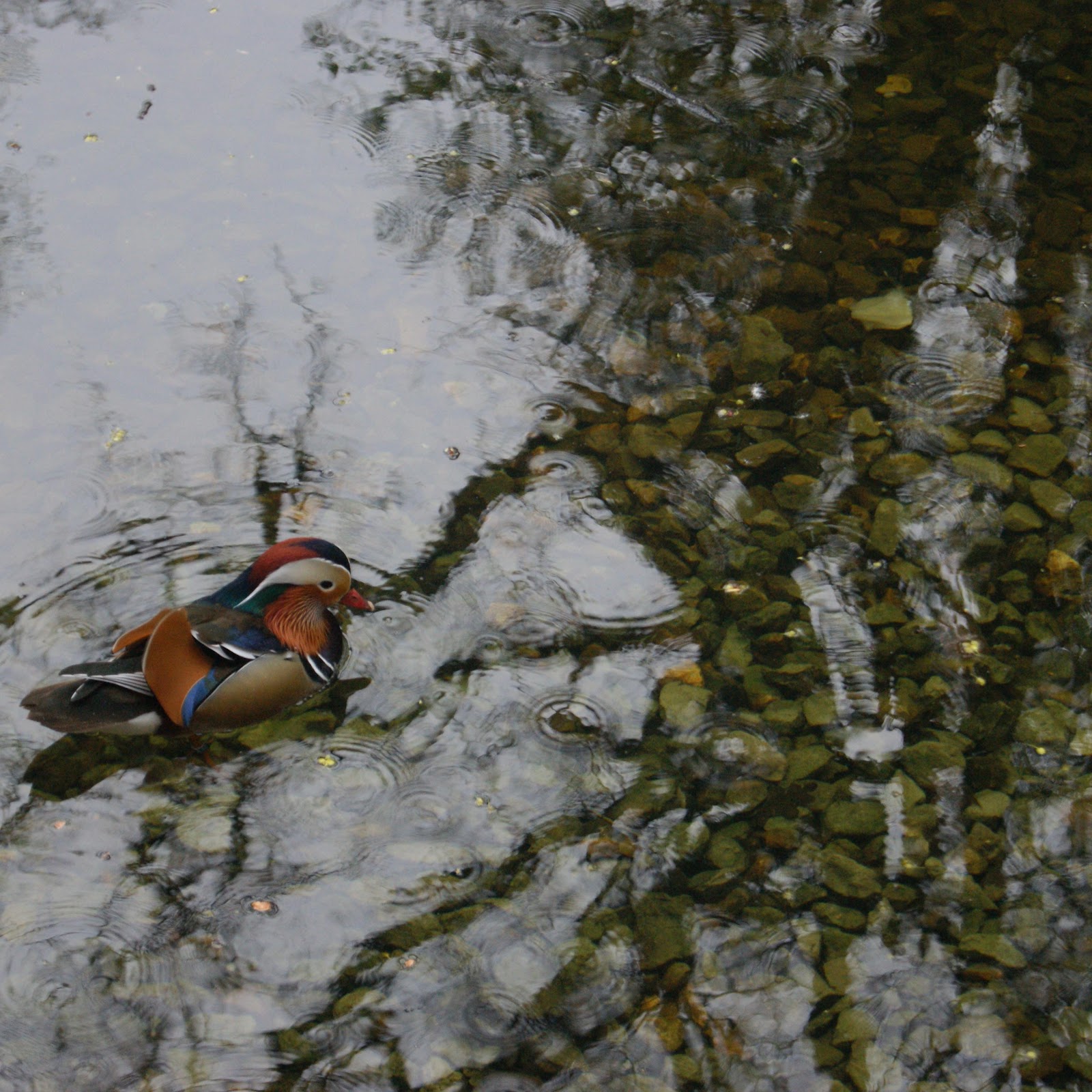 A colorful Mandarin duck swims in a shallow pond during a light rain shower with tree reflections and small pebbles showing under the water.
