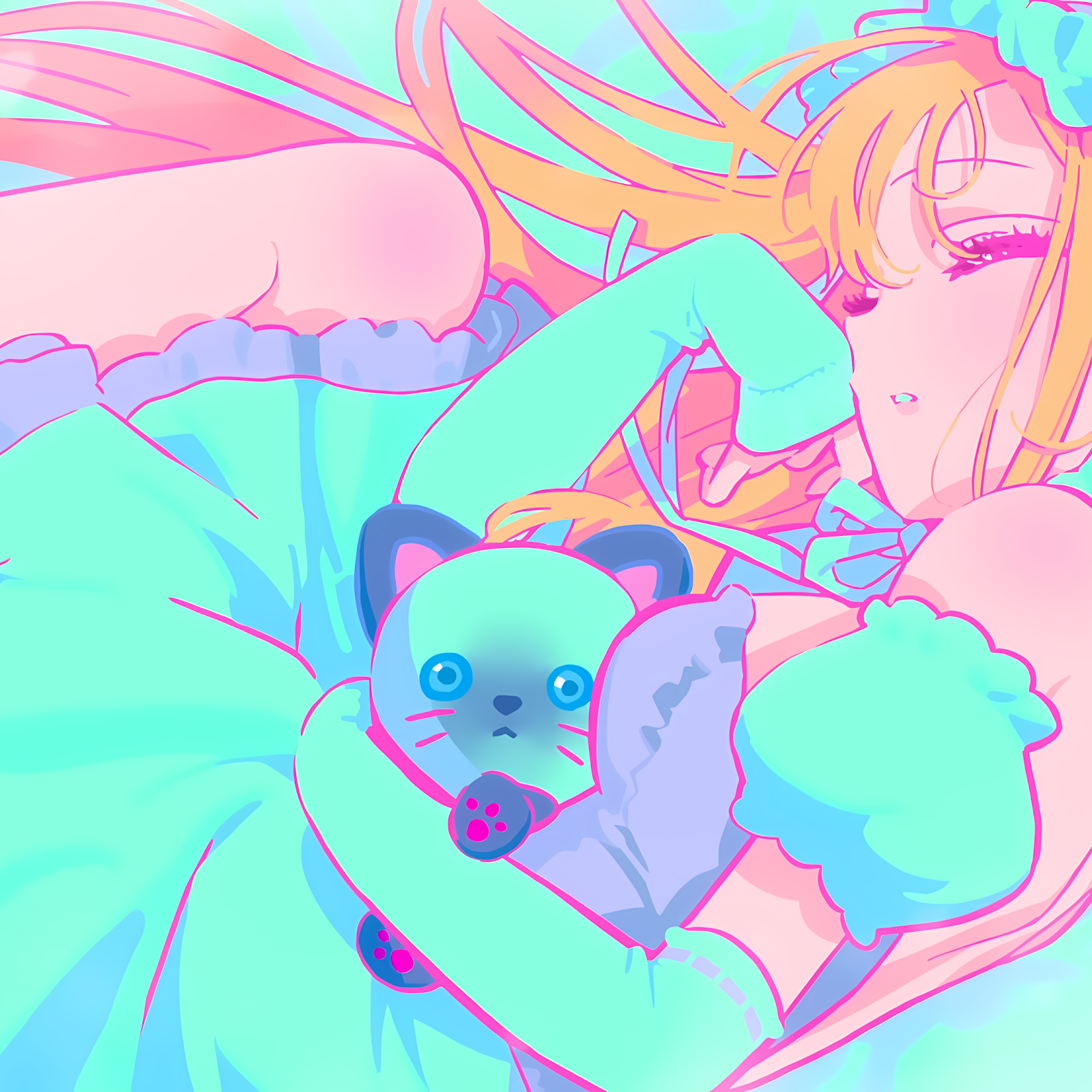 Marin Kitagawa from My Dress-Up Darling lies down while hugging a cute cat plushie in a bright pastel world filled with vibrant pink and cyan tones.