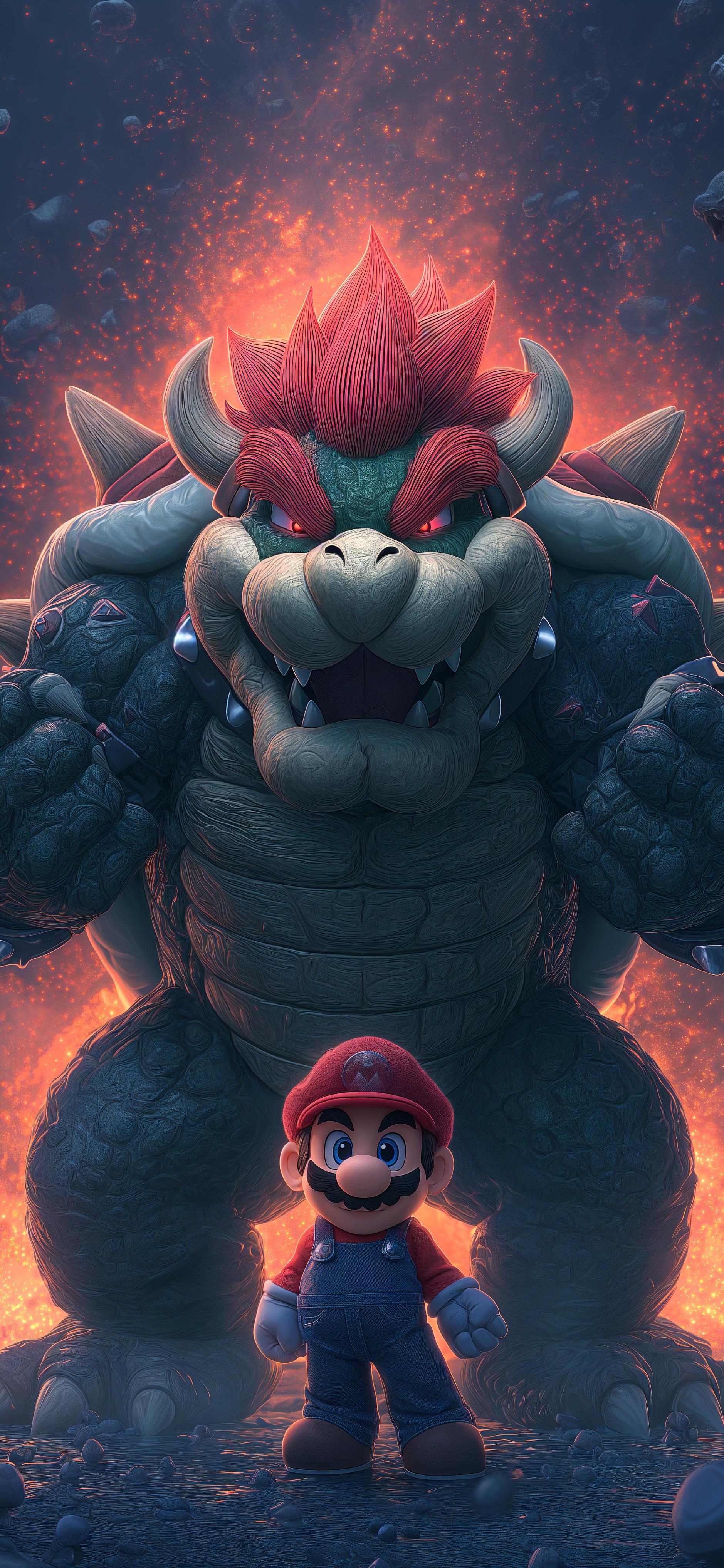 Mario and Giant Bowser - Digital Fantasy Illustration 2K iPhone Wallpaper (1879x4071)