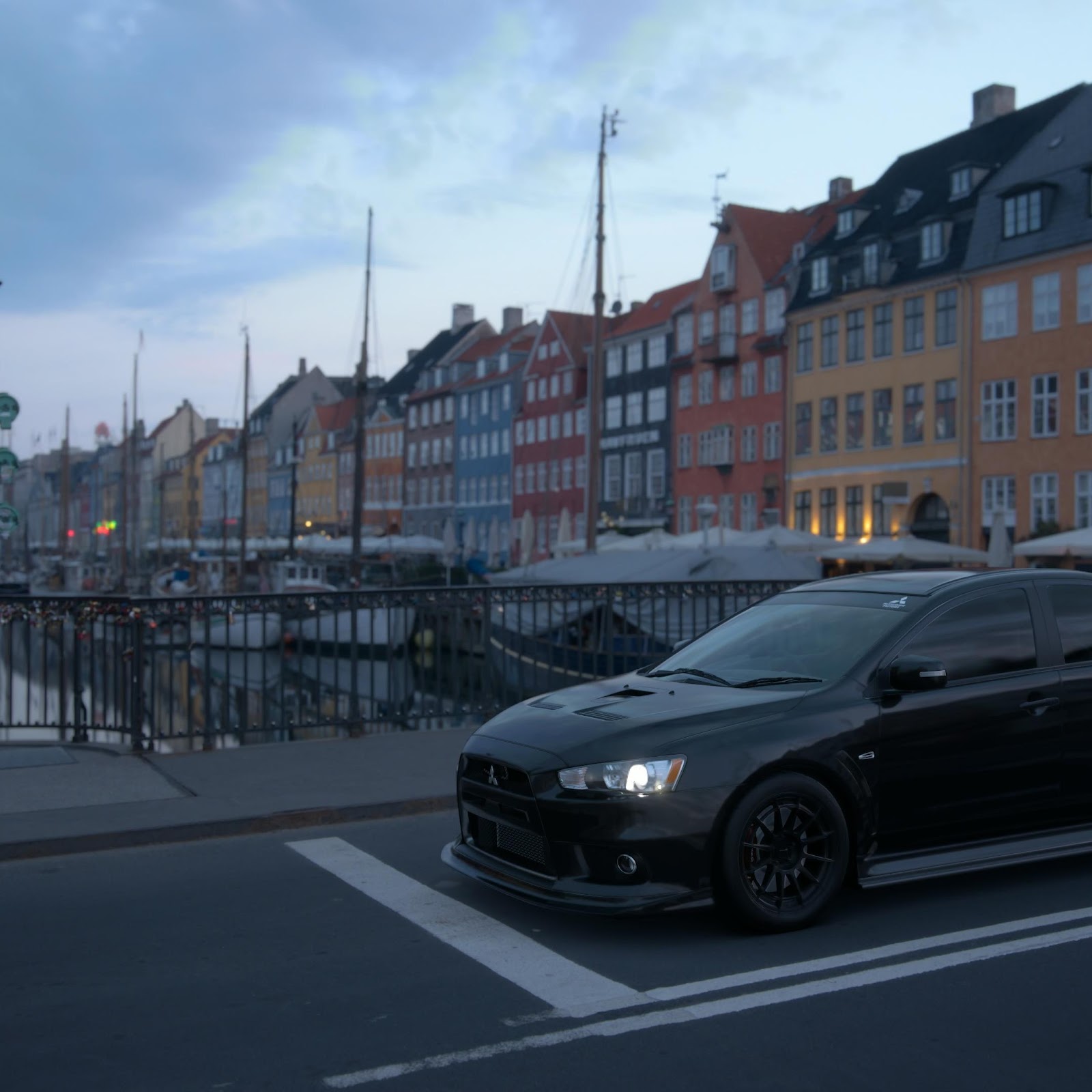 A black Mitsubishi Lancer Evolution X sits parked on a bridge next to the colorful buildings of Nyhavn under a soft evening sky in Copenhagen.