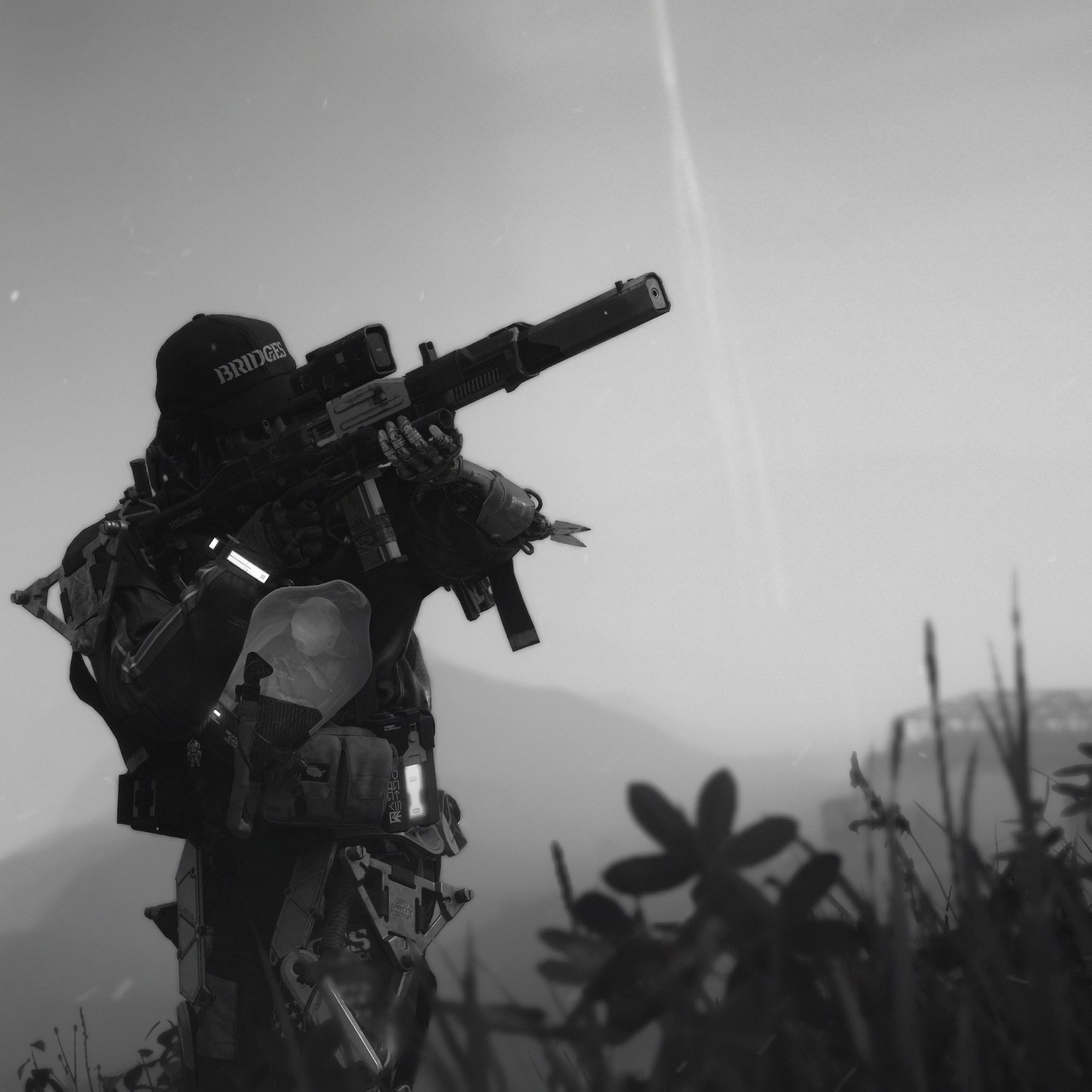 Sam Porter Bridges from Death Stranding aims his rifle on a foggy hillside while wearing a Bridges cap and exoskeleton gear in a dramatic black and white scene.