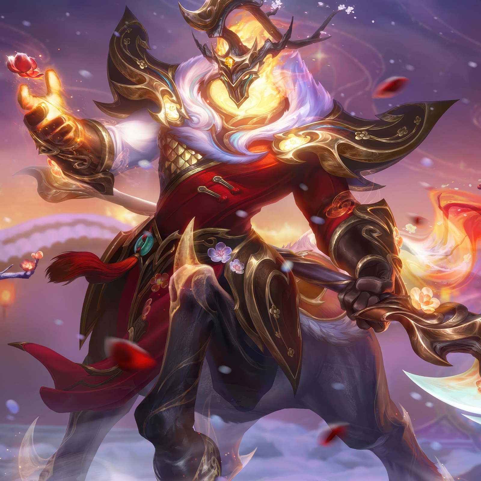 Hecarim from League of Legends stands in a snowy landscape with blooming plum blossoms while wearing red and gold armor with a glowing fire head and holding a large curved blade.