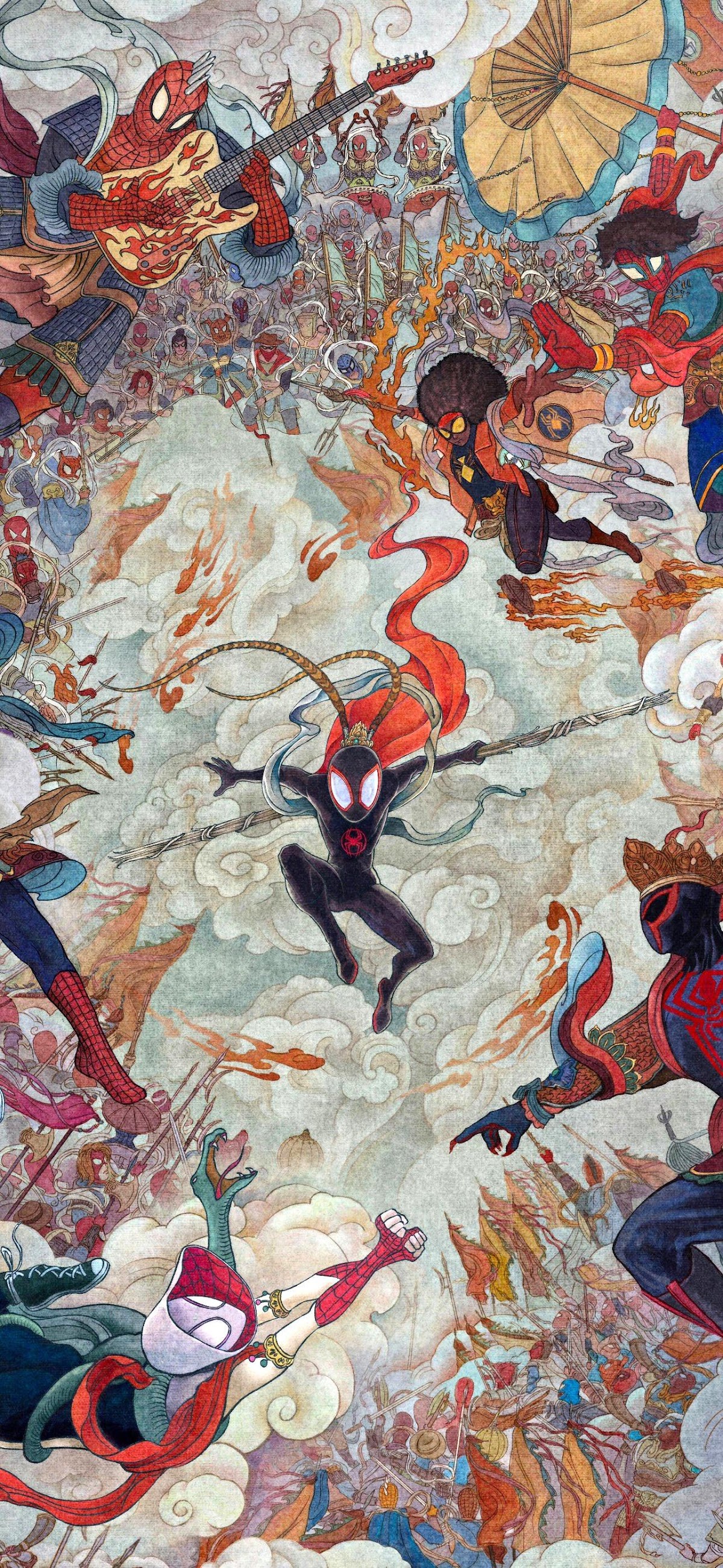 Spider-Verse Heroes Traditional Mural Full HD iPhone Wallpaper Miles Morales and Spider-Verse heroes are fighting in the clouds with a traditional Asian mural style showing heroic poses and historical armor. ka946 1.05 MB 1290x2796 Download original File Size: Dimensions: Resolution: Full HD Format: Mobile ID: Asian Art Gray Miles Morales Mural Spider-Gwen Spider-Man Spider-Verse