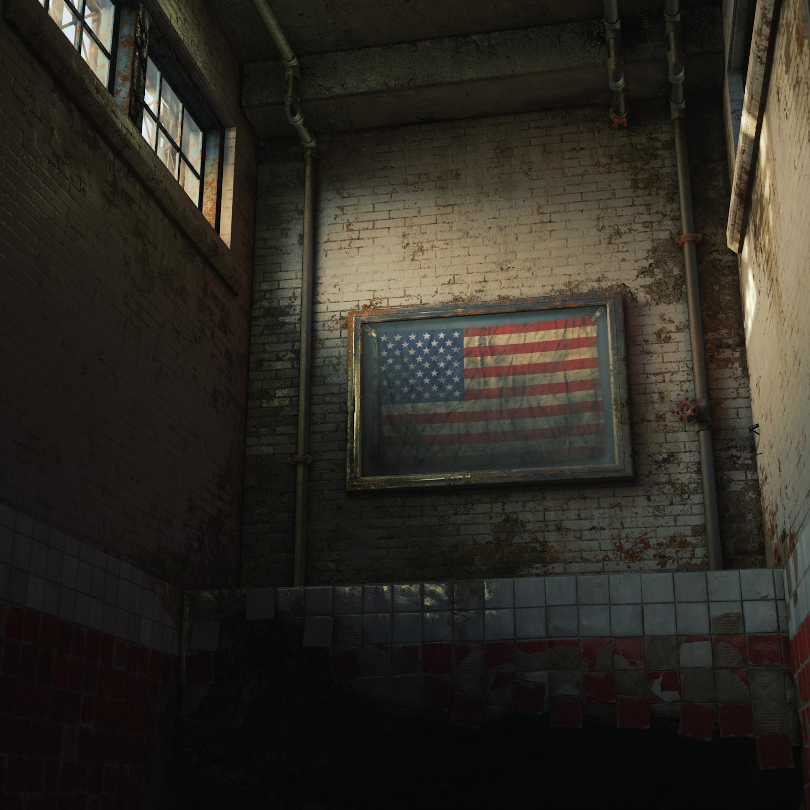 A framed American flag hangs on a dirty brick wall inside a dark abandoned building from The Last Of Us Part I showing a gritty cinematic atmosphere.