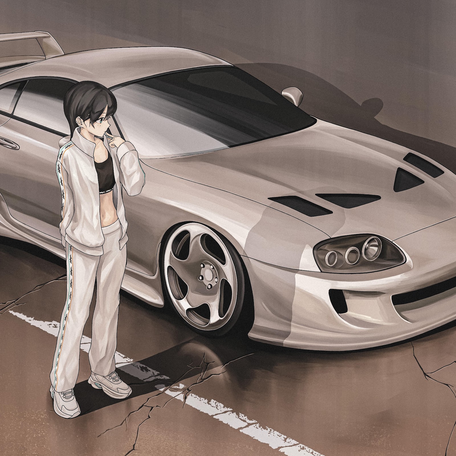 An anime girl wearing a white tracksuit stands next to a modified silver Toyota Supra on a cracked asphalt road with a clean digital art style.