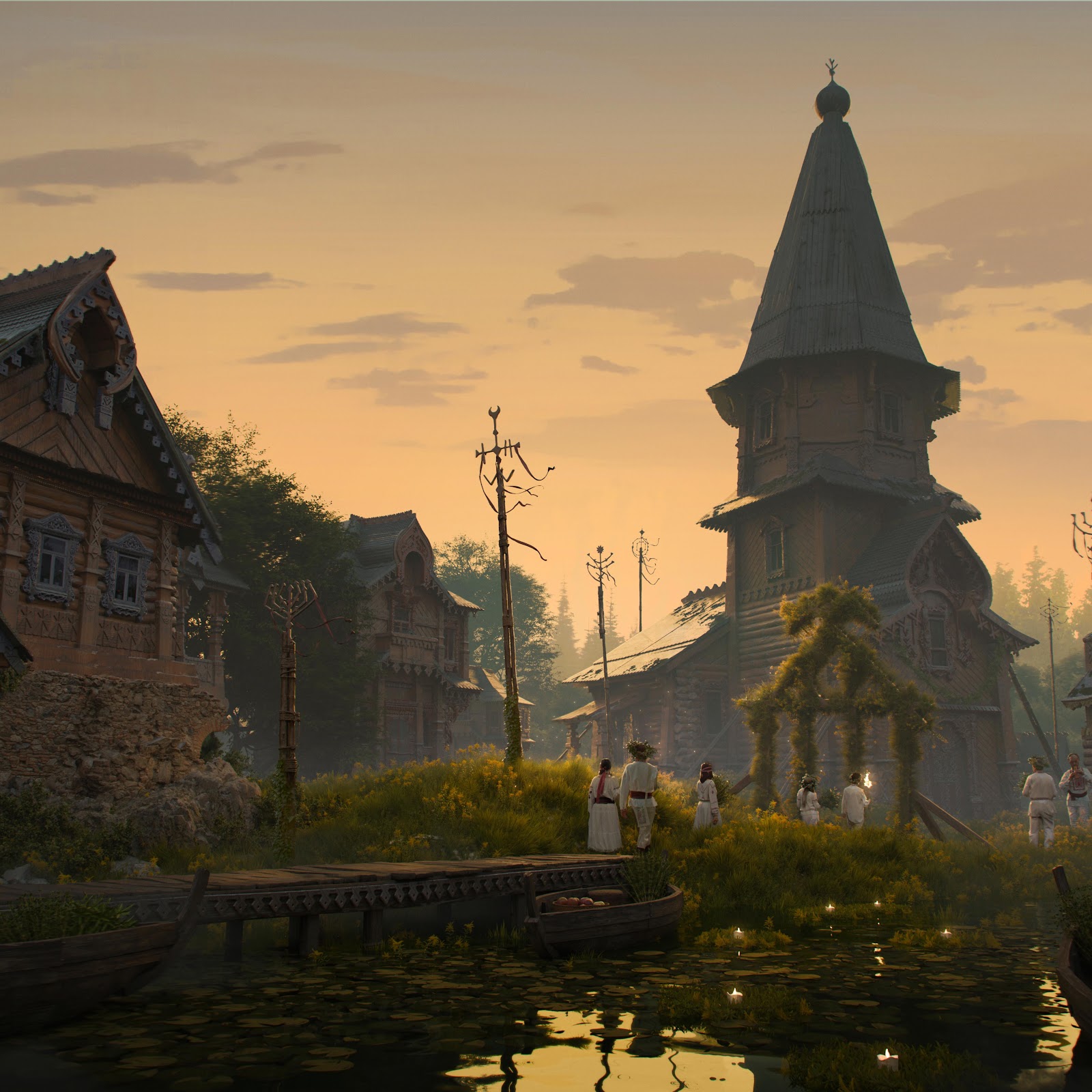 A traditional Slavic village stands along a quiet river with wooden houses and people in white robes under a golden sunset sky.
