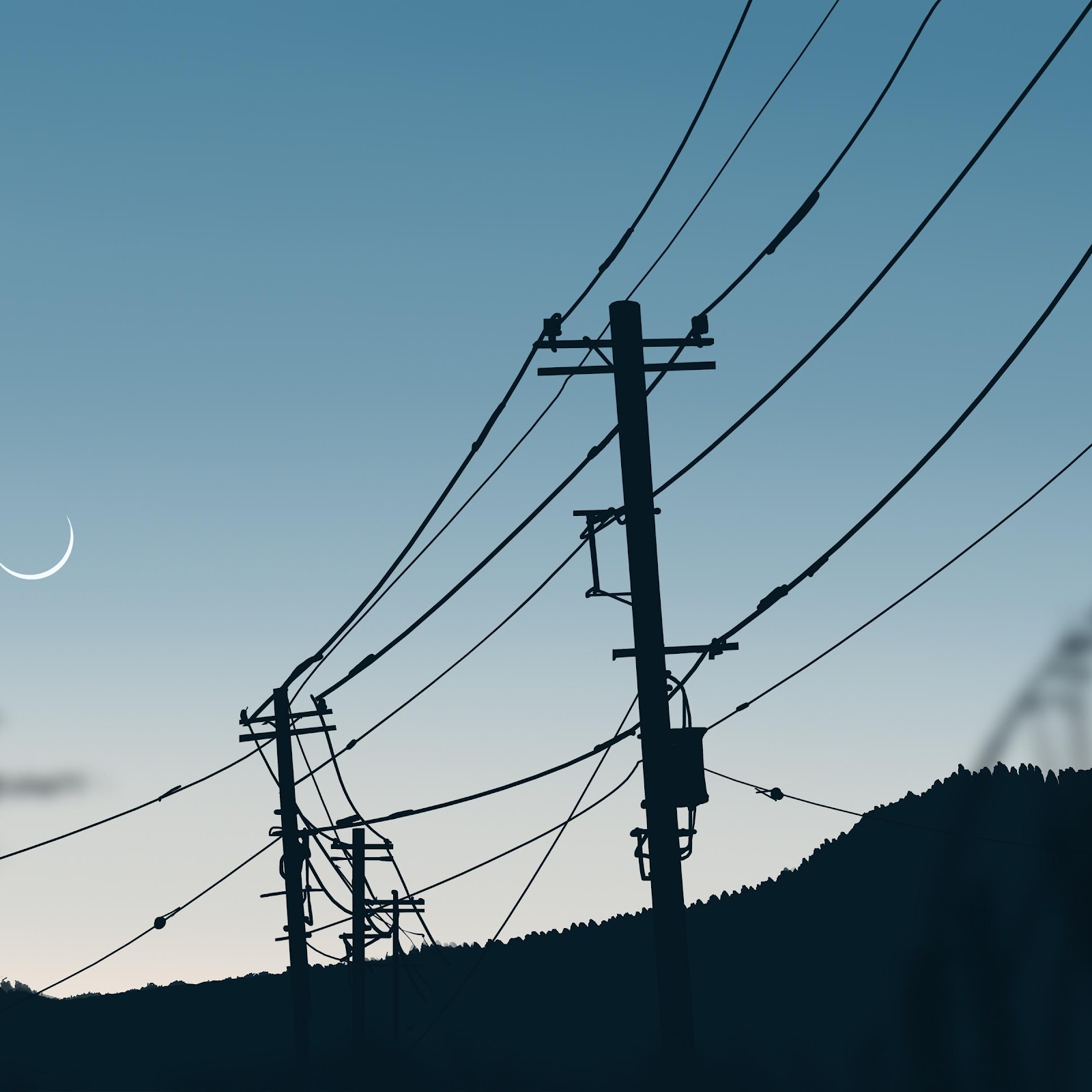 Dark utility poles and power lines stand against a teal evening sky with a thin crescent moon shining above silhouetted hills and soft blurry grass.