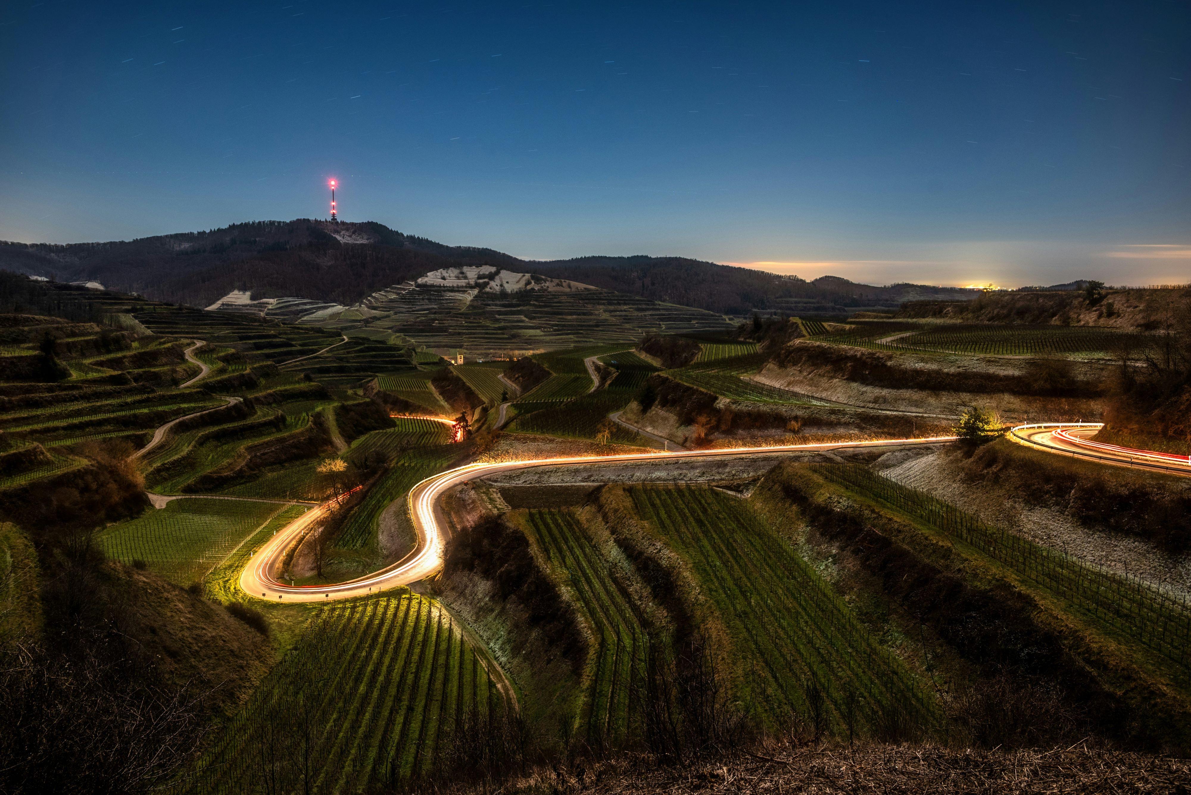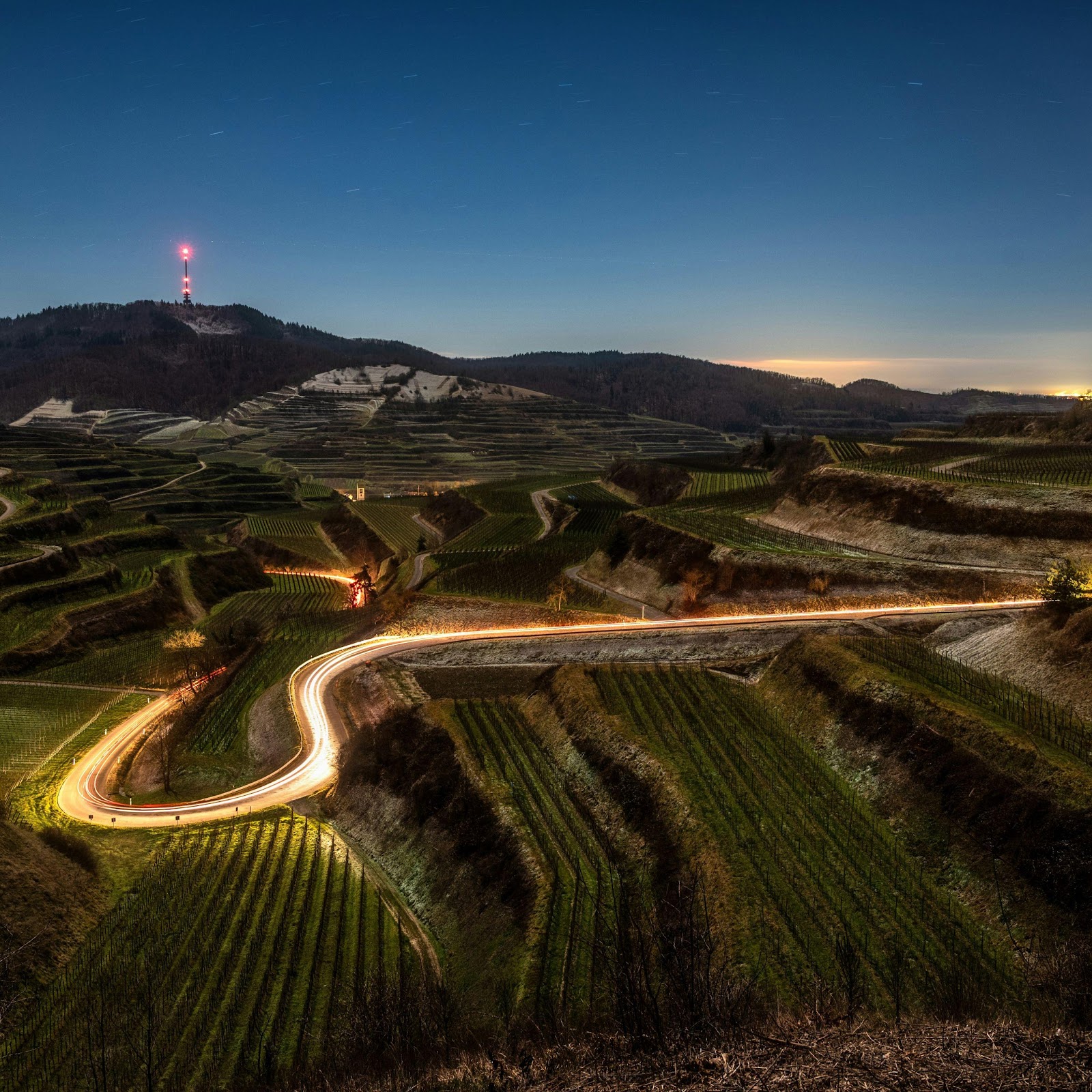 Glowing light trails from a car wind through terraced green vineyards on a hillside under a dark blue night sky with a tall radio tower in the distance.